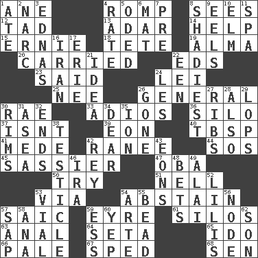 ACROSS 1. One (Scot) 4. Play 8. Perceives with the eye 12. Small amount or degree 13. The sixth month of the Jewish calendar 14. Assist 15. Bert's buddy 18. False hair 19. _ mater 20. Borne 22. Begley and Asner 23. Alleged 24. Flowery wreath 25. Born 26. Commissioned military rank 30. Actress Charlotte 33. Goodbye (Sp.) 36. Grain storage tower 37. Is not 39. Period of immesurable duration 40. Cook's measure (abbr.) 41. Ancient Persian 42. The wife of a rajah (variant) 44. Distress signal 45. More lively and spirited 47. Chief or king in Benin or Nigeria 50. Attempt 51. 1994 drama film starring Jodie Foster 53. By way of 54. Refrain by choice 57. Ketch in the Levant 59. Jane of fiction 61. Grain storage towers 63. Of or related to the anus 64. Stalk of a moss capsule 65. Wedding promise 66. Diluted with white 67. Moved rapidly 68. Elected rep. DOWN 1. Had dinner 2. Drug cop 3. Ferber et al. 4. Pace 5. Wrote a lyric poem 6. Floor protector 7. Before (prefix) 8. Most dubious of character or honesty 9. Snakelike fish 10. Shade tree 11. Health resort 16. SW Asia republic 17. One of the Great Lakes 21. The main thing one is thinking about 22. Car or cant ending 24. French article 26. Went 27. Chest bones 28. In addition 29. Chops off 30. Basketball hoops 31. Toward the sea 32. Extremities 34. Letter starter 35. Electrically charged atom 38. One of the two male reproductive glands 42. Marina Del _, California 43. Immeasurably long periods of time 46. Retirement account (abbr.) 48. Wagers 49. Jai _ 52. Ms. Damita and namesakes 53. Small bottle 54. Johnson of "Laugh-In" 55. Necklace unit 56. Thickened enlargement 57. Plant excrement 58. Santa ___, CA 59. Double-curved letter 60. Slangy assent 62. Manchild