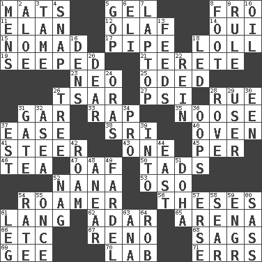 ACROSS 1. Floor protectors 5. Set 8. Away 11. Enthusiasm 12. Norwegian king 14. Fr. "Yes" 15. Wanderer 17. Corncob 18. Hang loosely or laxly 19. Oozed 21. Cigar-shaped 23. Modern: prefix 25. Wrote a lyric poem 26. Russian ruler of old 27. Air pressure measure (abbr.) 28. Regret 31. Slender fish 33. Strike 35. Trap for birds or small mammals 37. Relaxation 38. _ Lanka 40. Baking chamber 41. Navigate 43. Single 45. For each 46. Beverage made from leaves 47. Clumsy lout 50. Bits 52. Nanny 53. Bear (Spanish) 54. Nomad 56. College papers 61. Long (Scottish) 62. The sixth month of the Jewish calendar 65. Sports stadium 66. And so on (abbr.) 67. Western Nevada city 68. Sinks 69. Unit of force equal to gravity 70. Experiment locale 71. Blunders DOWN 1. Not women's 2. Medicinal plant 3. Not wild 4. Fastener 5. Grand Old Party 6. Connecticut Ivy Leaguer 7. Portable computer 8. One third of a yard 9. Court order 10. Lubricate 13. Gives food to 16. Cub Scout units 18. Directed 20. Letter starter 22. It's straight from the horse's mouth 24. Mouths or openings 26. Woody plant 28. Be footloose 29. One who makes use of a thing 30. Car or cant ending 31. Yard entry 32. Toward the sea 34. Adept person 36. I made a mistake 37. Eastern Standard Time (abbr.) 39. To the inside or interior of 42. Wander aimlessly 44. 90 degrees 48. Approach 49. Burden 51. Capital of the state of Qatar 52. Tired old horse 54. Pace 55. Single time 57. Celtic language 58. Scorch 59. Engineer (abbr.) 60. Backtalk 61. Part of a journey 63. Santa ___, CA 64. Director Reiner