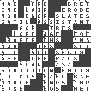 ACROSS 1. Big _ 4. Before (prefix) 7. Cy Young winner Saberhagen 11. Compass dir. 12. Den 13. Wear away 14. And not 15. Engineer (abbr.) 16. Chalkboards 17. Smooth fabric 19. Aide 21. Republican Party 23. Angers 24. Old wives' tales, e.g. 25. Mature 26. Enemy 29. More uncommon 30. Followers of ems 31. Santa ___, CA 32. Lower and raise head in agreement 33. Big collection agency 34. Arrange properly for use 35. 100% 36. _-fi 37. Religious groups 40. Unit of force equal to gravity 41. Area sheltered from the wind 42. Friends 43. Glance over 45. White ___ sheet 46. Decision 51. Gives off 55. Foolish or stupid persons 56. Highlander 58. Actress Charlotte 59. Having high moral qualities 60. Conclusions 61. Electrical Unit 62. Celtic language 63. Greek goddess of the dawn 64. Remaining after all deductions DOWN 1. Not women's 2. Small Philippine buffalo 3. An absolute certainty 4. Baking dish 5. Capital of Latvia 6. Blunders 7. Naughty children 8. Round or rotation of duties 9. Genesis locale 10. Trial 12. Poe poem 13. Otherwise 16. Founders of families 18. Russian composer Stravinsky 20. Public displays of written messages 22. For each 24. Dipping utensil 25. Nest on high 26. Goes without food and/or water 27. Washington bills 28. Consume 29. Hero or heavy, e.g. 32. Tired old horse 33. Ancient Celtic tribe of eastern Britain 36. Narrow boards 37. Health resort 38. Artist's stands 39. Burrowing marine mollusk 43. Fur scarf 44. Quote 46. Trig term 47. Aroma 48. Chest bones 49. Double curve, resembling the letter S 50. Billionth: prefix 52. SW Asia republic 53. Docile 54. Back-to-school mo. 57. Begley and Asner