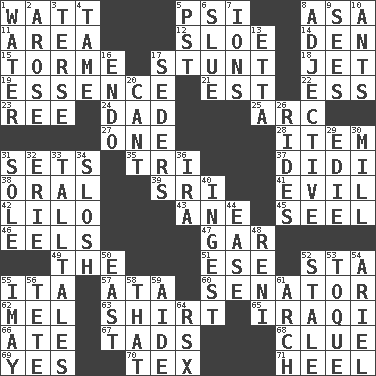 ACROSS 1. Electrical Unit 5. Air pressure measure (abbr.) 8. White ___ sheet 11. Type of rug 12. _ gin 14. Lair 15. Singer Mel 17. Difficult or unusual or dangerous feat 18. Passenger plane 19. Core 21. Eastern Standard Time (abbr.) 22. Double-curved letter 23. Portuguese money of account (variant) 24. June honoree 25. Curve 27. Single 28. A distinct part 31. Puts into a specified state 35. Three (prefix) 37. "You Light Up My Life" star Conn 38. Spoken 39. _ Lanka 41. Morally bad or wrong 42. _ and Stitch 43. A saturated hydrocarbon 45. Stitch closed the eyes of (a falcon) 46. Snakelike fish 47. Slender fish 49. Definite Article 51. Compass dir. 52. R.R. building 55. Call ___ day 57. "One Day ___ Time" 60. Legislator 62. Cartoonist voice _ Blanc 63. Upper-body garment 65. Resident of Iraq 66. Had dinner 67. Small boys 68. A slight indication 69. Affirmative reply 70. John Ritter's dad 71. Person who is morally reprehensible DOWN 1. Wetness 2. Came up 3. Laconic 4. Not wild 5. Pacific Standard Time (abbr.) 6. Turn sharply 7. Charged atoms 8. Descriptive word 9. Observes 10. Pismires 13. Singer James 16. Inside; within (prefix) 17. Spring feasts 20. Patter 26. Amusement-park features 29. Singer Brickell 30. Place where flour is made 31. Not divided or shared with others 32. One of the Great Lakes 33. Baron Munchausen's specialties 34. Splash clumsily 36. Lyricist Gershwin 40. Consume 44. Relaxation 48. Painter Guido (1575-1642) 50. Compass direction 52. Lacking originality or spontaneity 53. Woman's close-fitting hat 54. Satellite of Uranus 55. "If ____ say so..." 56. False hair 58. Not this but _ 59. Helper 61. Bowlike part 64. Acura sports coupe