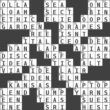ACROSS 1. Spanish pot 5. Ocean 8. Single 11. Rich soil 12. Religious group 14. Storage container 15. Value system 17. Writer Wiesel 18. I made a mistake 19. Place where plants grow 21. Window treatments 23. To sift 25. Is not 26. Slanted text style (abbr.) 27. Corporate head (abbr.) 28. Lair 31. One of the 12 tribes of Israel 33. Pet locale 35. Bee-related 37. Plate 38. Overdraft (abbr.) 40. Otherwise 41. Standard of perfection 43. Nervous spasm 45. Keyboard modifier key 46. By way of 47. Binary compound 50. Den 52. Genesis locale 53. Shade tree 54. Sunflower state 56. Portable computer 61. Grant temporary use of 62. Mass 65. Tall tales 66. Car or cant ending 67. Beverages made from leaves 68. Institutes legal proceedings 69. Compass dir. 70. _ Lanka 71. Command DOWN 1. Cassini of fashion 2. Globular water bottle used in Asia 3. Cowardly lion portrayer 4. Among 5. Compass dir. 6. Snakelike fish 7. Being or containing an acid 8. Mitch Miller's instrument 9. Cuts off 10. Followers of ems 13. Laconic 16. Sure thing 18. Elect 20. Anneal 22. Small Philippine buffalo 24. Enthusiasm 26. South American Indian 28. Deli pickle 29. 90 degrees 30. Compass dir. 31. "You Light Up My Life" star Conn 32. At sea 34. Pacific Standard Time (abbr.) 36. Lightbulb-shaped fruit 37. HTML Container Element 39. Do some clerical work 42. Hats (slang) 44. Give a ring to 48. Started a card game 49. Follows as a consequence or result 51. "If ____ say so..." 52. Conclude 54. Peachy ____! 55. Queen of England 1702-14 57. Romantic infatuation 58. Loyal 59. Singles 60. Inconspicuous attention getter 61. Area sheltered from the wind 63. Impair 64. Air pressure measure (abbr.)