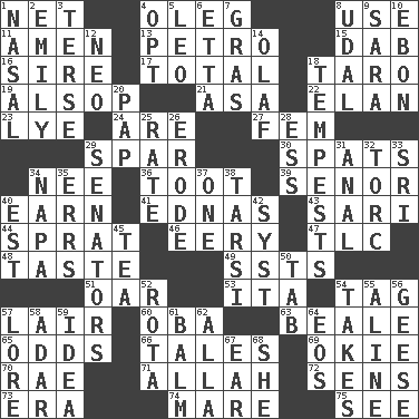 ACROSS 1. Fish or hair follower 4. Cassini of fashion 8. Purpose 11. So be it 13. Stone: prefix 15. Apply (a substance) by light strokes 16. Male parent of an animal 17. "_____ Recall" 18. Edible starchy tuberous root 19. Columnist Joseph or Stewart 21. White ___ sheet 22. Enthusiasm 23. Potassium hydroxide 24. "We ___ not amused" (Victoria) 27. Opposite of masc. 29. Practice fight 30. Arguments over trivial matters 34. Born 36. A blast of a horn 39. Sir (Sp.) 40. Merit 41. Ferber et al. 43. Indian skirt 44. Small fatty European fish 46. Suggestive of the supernatural 47. Affectionate concern, for short 48. Clothes sense 49. Fast planes 51. Boat paddle 53. Call ___ day 54. Label 57. Den 60. Chief or king in Benin or Nigeria 63. Memphis, Tenn. Street 65. Likelihood 66. Falsehoods 69. Migrant worker of the '30s 70. Actress Charlotte 71. Assad's deity 72. Elected reps. 73. Epoch 74. Female horse 75. Perceive with the eye DOWN 1. Rhinal 2. Poet Dickinson 3. Laconic 4. Choose 5. Lion 6. Singer James 7. Pate de foie ____ 8. Allodial 9. "Two Mules for Sister ____" 10. Inky black, to poets 12. Modern: prefix 14. Norwegian king 18. Storms 20. Infant food 25. Assign a rank or rating to 26. Wear away 28. Double-curved letter 29. Legislators 31. Of or related to the anus 32. Torque (variant) 33. Indian title of respect (Mr.) 34. California wine valley 35. Blunders 37. Single 38. Tarsus (plural) 40. Eastern Standard Time (abbr.) 42. System (abbr.) 45. Beverage made from leaves 50. Bar bill 52. Roll call or roster of names 54. Receives possession of 55. Place in a line 56. Honkers 57. Old wives' tales, e.g. 58. The sixth month of the Jewish calendar 59. The main thing one is thinking about 61. Lip ointment 62. Silent film actress Nazimova 64. Greek goddess of the dawn 67. Hearing organ 68. A female animal or person