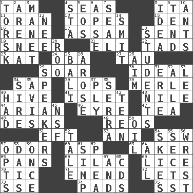 ACROSS 1. Scottish cap 4. Oceans 8. Call ___ day 11. NW Algerian seaport 13. Drinks excessively 15. Lair 16. French philosopher Descartes 17. Indian state 18. Transmitted 19. Scornful expression 21. Biblical high priest 22. Small boys 23. Krazy ___ of comics 24. Chief or king in Benin or Nigeria 27. The 19th letter of the Greek alphabet 29. Fly high 30. Standard of perfection 34. Plant excrement 36. Chops off 39. Haggard of country music 40. Hub of activity 41. Small island 43. The longest river in the world 44. Believer in; advocate of (suffix) 46. Jane of fiction 47. Beverage made from leaves 48. Writing tables 49. Vintage cars 51. Lizard (obsolete) 53. Black tropical American cuckoo 54. Compass dir. 57. Scent 60. Cleo's killer 63. Member of a famous L.A. basketball team 65. Zero-star reviews 66. Pale purple color 69. Louse (plural) 70. Nervous spasm 71. Make improvements or corrections to 72. Allows 73. Compass dir. 74. Groovy apts. 75. Fast jet (abbr.) DOWN 1. Cod relative 2. Sports stadium 3. French painter Edouard 4. R.R. building 5. Greek goddess of the dawn 6. Domed church section 7. Lick closed 8. It may be bright or harebrained 9. Look after 10. Pismires 12. Born 14. Stricken, poetically 18. SAT takers 20. Friend of Pooh 25. Indonesian resort city 26. Came up 28. Direct toward a target or goal 29. Orators 31. One of the Great Lakes 32. Silent film actress Nazimova 33. Area sheltered from the wind 34. Beget 35. Deliberation 37. Apply oneself diligently 38. Spanish missionary in California 40. Possessed 42. Adolescent 45. Overdraft (abbr.) 50. Petroleum 52. Story 54. Atmospheres 55. Religious groups 56. Obtain by seizing forcibly or violently 57. Elects 58. Raised platform 59. At one time in the past 61. Simple or foolish person 62. Entreaty 64. 100% 67. Added to 68. Music discs