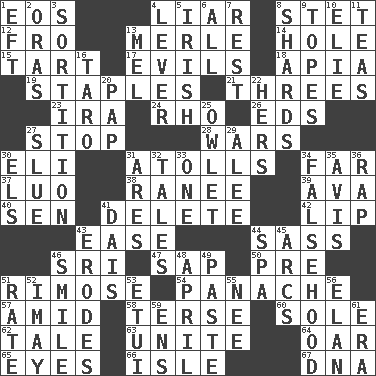 ACROSS 1. Greek goddess of the dawn 4. One who doesn't tell the truth 8. Proofreading order 12. From 13. Haggard of country music 14. Hollow 15. Small pie 17. Vices 18. Capital of Western Samoa 19. Paper fasteners 21. Threesomes 23. Retirement account (abbr.) 24. 17th letter of the Greek alphabet 26. Begley and Asner 27. Constrict 28. Armed conflicts 30. Biblical high priest 31. Ringlike coral islands and reefs 34. Distant 37. Nilotic language 38. The wife of a rajah (variant) 39. Actress Gardner 40. Elected rep. 41. Keyboard key 42. Mouth edge 43. Relaxation 44. Backtalk 46. _ Lanka 47. Plant excrement 50. Before (prefix) 51. Full of chinks, cracks, or crevices 54. Flamboyance 57. Among 58. Laconic 60. Flatfish 62. Lie 63. Join together 64. Boat paddle 65. Snake ____ (dice throw) 66. Capri or Wight 67. Heredity factor (abbr.) DOWN 1. Lizard (obsolete) 2. Mouths or openings 3. Decision 4. Crowbar 5. From or relating to Ireland 6. Everything 7. State of inaction 8. Pottery fragments 9. Drinks excessively 10. Writer Wiesel 11. Afternoon social gatherings 13. Cartoonist voice _ Blanc 16. Pacific island yam 20. Infant food 22. Possessive pronoun 25. A small or young owl 27. Change direction abruptly 29. Toward shelter 30. Raised railways 31. Ancient Greek god of war 32. Lies 33. Single 34. It jiggles the polygraph 35. Advice 36. Reproach for some lapse or misdeed 41. Raised platform 43. Eats (away) 44. Health resort 45. Arches 46. Grin 48. Showery time 49. Thick mixture 51. Pace 52. "If ____ say so..." 53. Needle case 55. Born 56. Style 59. Followers of ems 61. Period