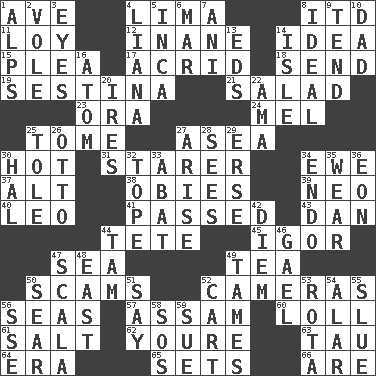 ACROSS 1. "___ Maria" 4. Pale green bean 8. It would 11. Myrna of the movies 12. Empty; void 14. The content of cognition 15. Entreaty 17. Sour-tasting 18. Transmit 19. French poetic form 21. First course 23. Mouth or opening 24. Cartoonist voice _ Blanc 25. Heavy book 27. Toward the sea 30. Being at a high temperature 31. A viewer who gazes fixedly 34. She-sheep 37. The first octave above the treble staff 38. Off-Broadway awards 39. Modern: prefix 40. Lion 41. Went by 43. One of the 12 tribes of Israel 44. Wig 45. Russian composer Stravinsky 47. Ocean 49. Afternoon social gathering 50. Fraudulent business schemes 52. Devices for capturing images 56. Oceans 57. Indian state 60. Hang loosely or laxly 61. Table seasoning 62. You are 63. The 19th letter of the Greek alphabet 64. Epoch 65. Puts into a specified state 66. "We ___ not amused" (Victoria) DOWN 1. High mountains 2. Short-tailed, large-bodied rat 3. Sight organs 4. Climbing, woody, usually tropical vines 5. South American Indian 6. Spoil 7. Cuckoo 8. Perfect 9. Watch over 10. June honoree 13. Begley and Asner 14. Small island 16. Tiny particle 20. Angers 22. Wet nurse (var.) 25. Lacquered or enameled metalware 26. "Beetle Bailey" pooch 27. Originate 28. Perceives with the eye 29. Celtic language 30. Actor Linden 32. Drink excessively 33. Blind as ____ 34. Inside; within (prefix) 35. Erode 36. A really long time 42. South Vietnam president (1954) 44. Scottish cap 46. Highlander 47. Any of the three canals of the cochlea 48. Compass direction 49. Makes less strong or intense 50. Shrivel 51. Declare 52. Draw slowly or heavily 53. Round or rotation of duties 54. Having or resembling wings 55. Turn sharply 56. Compass dir. 58. Mayday 59. Take to court