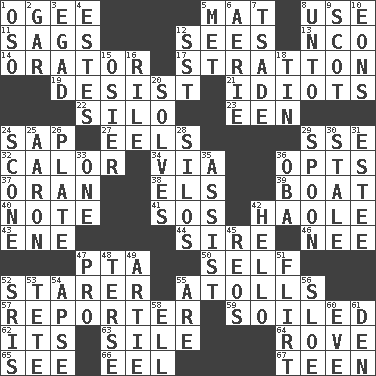 ACROSS 1. Double curve, resembling the letter S 5. Floor protector 8. Purpose 11. Sinks 12. Observes 13. Non-commissioned officer (abbr.) 14. Speaker 17. Ski resort town in Vermont 19. Stop 21. Foolish or stupid persons 22. Grain storage tower 23. Car or cant ending 24. Plant excrement 27. Snakelike fish 29. Compass dir. 32. Bodily heat indicating an inflammation 34. By way of 36. Elects 37. Northwest Algerian city 38. Raised railways 39. Water vessel 40. Observe 41. Distress signal 42. White Person, in Hawaii 43. Compass dir. 44. The founder of a family 46. Born 47. Parent Teacher Assoc. 50. Itself 52. A viewer who gazes fixedly 55. Ringlike coral islands and reefs 57. Newsperson 59. Dirtied 62. ___ a Wonderful Life 63. Filth; sediment 64. Be footloose 65. Observe 66. Snakelike fish 67. Adolescent DOWN 1. Bear (Spanish) 2. Slender fish 3. Mild oath 4. _____ Park, CO 5. Was introduced to 6. Nest on high 7. Sadhe (variant) 8. To (old English) 9. Native of Scotland 10. Immeasurably long periods of time 12. Fast jet (abbr.) 15. Flexible twig of a willow tree 16. Cause heat under the collar 18. Shallow baking pan 20. Finds the solution 24. Biscuitlike quick bread 25. Composer Copland 26. Food holder 28. Grain storage towers 29. Soup utensil 30. Having lost freshness 31. First name in cosmetics 33. Single 35. Help 36. Chief or king in Benin or Nigeria 42. Phone greeting 45. Vintage cars 47. Adept person 48. Laconic 49. Nick name for Arthur 51. Seductive woman who exploits men 52. Indian titles of respect 53. Wig 54. Domed church section 55. "We ___ not amused" (Victoria) 56. _ gin 58. Pipe bend 60. First lady 61. Lair