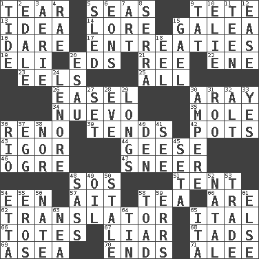 ACROSS 1. Pull into pieces 5. Oceans 9. False hair 13. It may be bright or harebrained 14. Old wives' tales, e.g. 15. An organ shaped like a helmet 16. Have the gumption 17. Pleas 19. Biblical high priest 20. Begley and Asner 21. To sift 22. Compass dir. 23. Snakelike fish 25. 100% 26. Artist's stand 30. Like ___ of sunshine 34. New (sp.) 35. Undercover agent 36. Former U.S. Attorney General Janet 39. Is inclined (to) 42. Cooking vessels 43. Russian composer Stravinsky 44. Honkers 46. Legendary monster 47. Scornful expression 48. Distress signal 51. Portable shelter 54. Car or cant ending 57. Small island 58. Afternoon social gathering 60. "We ___ not amused" (Victoria) 62. Interpreter 65. Slanted text style (abbr.) 66. Hauls 67. One who doesn't tell the truth 68. Small boys 69. Toward the sea 70. Conclusions 71. Toward shelter DOWN 1. Periodic rise and fall of the sea level 2. Peak District village in England 3. Nest on high 4. Actress Charlotte 5. Downhill vehicle 6. Immeasurably long periods of time 7. Tate display 8. Father Junipero _ 9. Make lace 10. Writer Wiesel 11. Adolescent 12. Relaxation 15. Highlander 18. Snakelike fish 20. Son of Isaac 24. Poe poem 27. Arrange properly for use 28. First lady 29. Yearns 30. Electrical Unit 31. Friend of Pooh 32. Keyboard modifier key 33. Affirmative reply 36. River (Sp.) 37. Ovum 38. Not either 40. Lair 41. Perceive with the eye 45. Stalk of a moss capsule 48. Backtalk 49. Lubricate 50. Showing deterioration from age 52. Brizilian seaport 53. Swap 54. Singer James 55. Greek god of love 56. Nathan's nickname 58. Frog relative 59. Blunders 61. Otherwise 63. Teachers' org. 64. Metal container 65. Call ___ day