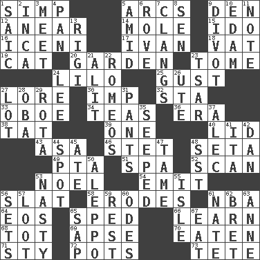 ACROSS 1. Simple or foolish person 5. Arches 9. Lair 12. Approach 14. Undercover agent 15. Wedding promise 16. Ancient Celtic tribe of eastern Britain 17. _ the terrible 18. Large container 19. Domesticated feline 20. Place where plants grow 23. Heavy book 24. _ and Stitch 25. Abrupt rush of wind 27. Old wives' tales, e.g. 30. Naughty child 32. R.R. building 33. Mitch Miller's instrument 34. Afternoon social gatherings 36. Period 38. Make lace 39. Single 40. Flaplike covering 43. White ___ sheet 46. Proofreading order 48. Stalk of a moss capsule 49. Parent Teacher Assoc. 51. Health resort 52. Glance over 53. Christmas carol 54. Send forth 56. Narrow board 58. Eats (away) 61. Basketball assoc. 64. Greek goddess of the dawn 65. Hurried 66. Acquire or gain knowledge or skills 68. Small child 69. Domed church section 70. Consumed 71. Filthy place 72. Cooking vessels 73. Wig DOWN 1. Ketch in the Levant 2. South American Indian 3. Confront 4. Baking dish 5. Among 6. Be footloose 7. Gives out a loud, resonant sound 8. Elected rep. 9. A piece of turf (Scot.) 10. Dutch treat 11. Make mention of 13. Swiss mountan, "Queen of the Mountains" 21. Set down 22. Lover boys 23. Russian ruler of old 24. Area sheltered from the wind 26. Shoshoni 27. Car dealer's back yard 28. Chief or king in Benin or Nigeria 29. Roll call or roster of names 31. Leg coverings 35. Oozed 37. Actor Baldwin 41. Call ___ day 42. One of the 12 tribes of Israel 44. Specific locale 45. Had dinner 47. Docile 48. Fast jet (abbr.) 50. City in Syria 53. Thoroughly unpleasant 55. Small island 56. Arranges properly for use 57. Plunder 59. Remainder 60. Lyric poems 61. Nathan's nickname 62. Cy Young winner Saberhagen 63. Singer Murray 65. Plant excrement 67. Erode