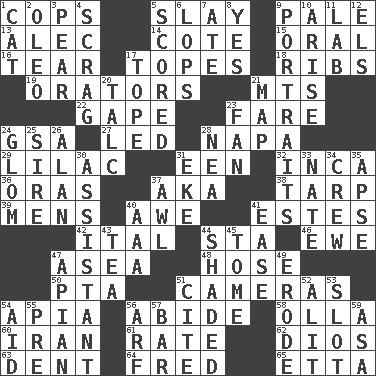 ACROSS 1. 911 reaches them 5. Kill 9. Light colored 13. Actor Baldwin 14. ____ d'Azur (French Riviera) 15. Relating to the mouth 16. Lacerate 17. Drinks excessively 18. Teases 19. Speakers 21. Mountains (abbr.) 22. Open wide 23. Conductor's collection 24. Girls' org. (abbr.) 27. Directed 28. California wine valley 29. Pale purple color 31. Car or cant ending 32. South American Indian 36. Mouths or openings 37. Alias (abbr.) 38. Canvas cover 39. Not women's 40. Deep reverence 41. _____ Park, CO 42. Slanted text style (abbr.) 44. R.R. building 46. She-sheep 47. Toward the sea 48. Flexible conduit 50. Parent Teacher Association (abbr.) 51. Devices for capturing images 54. Capital of Western Samoa 56. Remain 58. Rounded earthenware pot or jar 60. SW Asia republic 61. Pace 62. "Vaya con ____" 63. Undesirable depression on a surface 64. Flintstone 65. Singer James DOWN 1. Feline 2. Margarine 3. Lightbulb-shaped fruit 4. Lean end of the neck 5. Tallied 6. Chops off 7. Had dinner 8. Consenting reply 9. Likenesses of persons 10. Originate 11. Experiment locale 12. Raised railways 17. Drink excessively 20. Baby powder 21. Atlas unit 23. Air blower 24. Take by theft 25. The founder of a family 26. Actor Alda or Thicke 28. Teachers' org. 30. Aide 31. Make supply last 33. Nathan's nickname 34. Ship's personnel 35. Domed church section 37. Leather borer 40. American Automobile Association (abbr.) 41. Relaxation 43. Afternoon social gathering 44. Cast a shadow over 45. Heavy book 47. Bee-related 49. Wear away 51. Quote 52. Set down 53. Narrow opening 54. Help 55. Before (prefix) 56. Sandy's bark 57. Drinking establishment 59. White ___ sheet