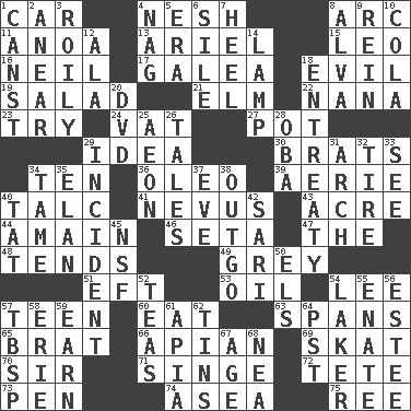 ACROSS 1. 4-wheeled motor vehicle 4. Delicate 8. Curve 11. Small Philippine buffalo 13. Satellite of Uranus 15. Lion 16. Famous astronaut Armstrong 17. An organ shaped like a helmet 18. Morally bad or wrong 19. First course 21. Shade tree 22. Grandmother 23. Attempt to accomplish something 24. Large container 27. Cooking vessel 29. It may be bright or harebrained 30. Naughty children 34. "___ Little Indians" 36. Margarine 39. Nest on high 40. Baby powder 41. Mole, birthmark 43. Measure of real estate 44. At full speed 46. Stalk of a moss capsule 47. Definite Article 48. Looks after 49. Jennifer or Joel 51. Bank Draft (abbr.) 53. Petroleum 54. Area sheltered from the wind 57. Adolescent 60. Ingest 63. Connects, as a bridge 65. Naughty child 66. Bee-related 69. Three-handed card game 70. Title for a knight 71. Burn superficially 72. False hair 73. Writing instrument 74. At sea 75. To separate or throw off DOWN 1. 2nd pers. sing. pres. of can (arch.) 2. Approach 3. Turbulent 4. Tired old horse 5. Period 6. Filth; sediment 7. The bottom of a shoe or boot 8. Inventor's middle name 9. It's straight from the horse's mouth 10. Root beer relative 12. In the manner of 14. Desk light 18. Plea 20. Movie disc 25. Period of immesurable duration 26. Falsehoods 28. Chief or king in Benin or Nigeria 29. Happening 31. Bowlike part 32. Hoop that covers a wheel 33. Observe 34. Docile 35. Style 37. Night before a holiday 38. Outlay 40. Make lace 42. Indian skirt 45. Overdraft (abbr.) 50. Raised railways 52. Afternoon social gatherings 54. Member of a famous L.A. basketball team 55. Related on the mother's side 56. First name in cosmetics 57. Cook's measure (abbr.) 58. One of the Great Lakes 59. Merit 61. Capital of Western Samoa 62. Airtight sealed metal containers 64. Pacific Standard Time (abbr.) 67. Ripen 68. Teachers' org.