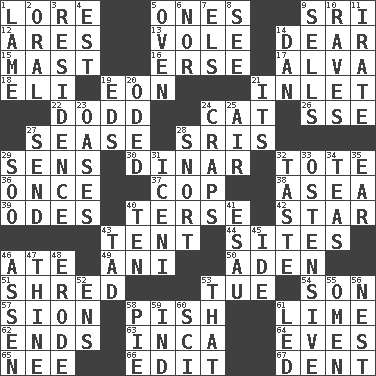 ACROSS 1. Old wives' tales, e.g. 5. Washington bills 9. _ Lanka 12. Ancient Greek god of war 13. Grand slam 14. Letter starter 15. Vertical spar for supporting sails 16. Celtic language 17. Inventor's middle name 18. Connecticut Ivy Leaguer 19. A really long time 21. An arm off of a larger body of water 22. Texas town _ City 24. Domesticated feline 26. Compass dir. 27. Gospel singer Marvin 28. Indian titles of respect 29. Elected reps. 30. Middle Eastern gold or silver currency 32. Haul 36. At one time in the past 37. Police officer (slang) 38. Toward the sea 39. Lyric poems 40. Laconic 42. Play the lead 43. Portable shelter 44. Locates 46. Had dinner 49. Black tropical American cuckoo 50. An important port of Yemen 51. Tear up 53. Third day of the wk. 54. Manchild 57. The Jewish people; Israel 58. Expression of disdain 61. Citrus frut 62. Conclusions 63. South American Indian 64. Nights before holidays 65. Born 66. Prepare for publication 67. Gouge DOWN 1. Unable to walk 2. Spoken 3. Home 4. Eastern Standard Time (abbr.) 5. Baking chamber 6. And not 7. Raised railways 8. Perceive with the eye 9. Makes a sale 10. All-night dance parties 11. Feeling or showing extreme anger 14. Daniel's nick name 19. Begley and Asner 20. Wrote a lyric poem 21. ___ a Wonderful Life 23. Fertile tracts in a desert 24. Dice game 25. Atmosphere 27. Post 28. Derisive sound 29. "Barney Miller" actor Jack 31. Ancient Celtic tribe of eastern Britain 32. Clothes sense 33. Clearly or manifestly demonstrative 34. Afternoon social gatherings 35. Ewer handle 40. Nine, plus one 41. He sold his birthright 43. Small boy 45. Binary compound 46. NE Netherlands city 47. One or ones belonging to thee 48. Eat (away) 52. Followers of ems 53. Not this but _ 55. Sign of things to come 56. A home for chicks 58. Sliced dessert 59. Working for oneself (abbr.) 60. _-fi 61. Directed