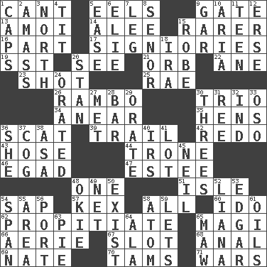 ACROSS 1. Patter 5. Snakelike fish 9. Yard entry 13. Mine, in Marseilles 14. Toward shelter 15. More uncommon 16. Role in a play 17. Seigniories (variant) 19. Fast jet (abbr.) 20. Observe 21. Globe 22. One (Scot) 23. Opportunity 25. Actress Charlotte 26. Role for Stallone 30. Musical group of three 34. Approach 35. Coop moms 36. Scram! 39. Go after with the intent to catch 42. Redecorate 43. Stockings 44. Marketplace scale 46. Mild oath 47. First name in cosmetics 48. Single 51. Small island 54. Plant excrement 57. A weed 58. 100% 60. Wedding promise 62. Appease 65. Wise men 66. Nest on high 67. Narrow opening 68. Of or related to the anus 69. Nathan's nickname 70. Scottish caps 71. Armed conflicts DOWN 1. Smile enhancers 2. Collect or gather 3. 0 degrees 4. Teat (slang) 5. Comfort 6. Writer Wiesel 7. Part of a journey 8. Sir (Sp.) 9. Slender fish 10. Roberta Peters solo 11. Adolescent 12. Celtic language 15. Loose flowing garment 18. Retirement account (abbr.) 20. Comedian Laurel of Laurel & Hardy 24. Declaimed 27. Was introduced to 28. Oblong piece of solid material 29. Speak pompously 30. Triads 31. To separate or throw off 32. Indiana (abbr.) 33. Bear (Spanish) 36. A female animal or person 37. Gear tooth 38. White ___ sheet 40. Big collection agency 41. Car dealer's back yard 45. Famous astronaut Armstrong 48. Migrant worker of the '30s 49. Fish or hair follower 50. Be 52. Woody, climbing, usually tropical plant 53. _ Allan Poe 54. Connect, as a bridge 55. Type of rug 56. Sweet dark-red dessert wine 58. Tiny particle 59. Allows 61. Petroleums 63. Sliced dessert 64. In the manner of 65. Informal term for the mouth