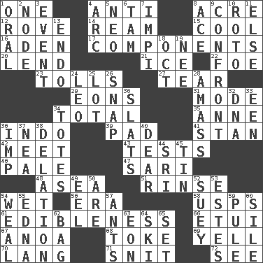 ACROSS 1. Single 4. Against 8. 43,560 square feet 12. Be footloose 14. 480, 500 or 516 sheets of paper 15. Calm and collected 16. An important port of Yemen 17. Pieces 20. Grant temporary use of 21. Frozen water 22. Enemy 23. For Whom the Bell _____ 27. Lacerate 29. Immeasurably long periods of time 31. Method 34. "_____ Recall" 35. Queen of England 1702-14 36. Southeast Asian peninsula 39. Groovy apt. 41. Comedian Laurel of Laurel & Hardy 42. Rendezvous 43. Trials 46. Diluted with white 47. Indian skirt 48. Toward the sea 51. Wash lightly 54. Soggy 56. Epoch 58. United States Postal Service (abbr.) 61. The property of being fit to eat 66. Needle case 67. Small Philippine buffalo 68. Puff or smoke 69. Shout 70. Long (Scottish) 71. In a ____ (agitated or irritated) 72. Observe DOWN 1. Of the mouth 2. Thickened enlargement 3. Happening 4. Curve 5. Modern: prefix 6. Scottish cap 7. Body of Kaffir warriors 8. Adept person 9. Meet 10. Printing process, for short 11. Otherwise 13. Inside; within (prefix) 18. Sep. follower 19. Born 24. Lion 25. Car dealer's back yard 26. Fastener 28. Collect or gather 30. Narrow boards 32. Heredity factor (abbr.) 33. Car or cant ending 34. Lugs 36. Mischievous child 37. Teachers' org. 38. Conveyance 40. Letter starter 44. _ Lanka 45. Metal container 49. Snakelike fish 50. "We ___ not amused" (Victoria) 52. Chop _ 53. _____ Park, CO 54. Welt 55. Pulitzer Prize-winning author Ferber 57. Pismires 59. Whimper 60. Filth; sediment 62. Container for groceries 63. Period of immesurable duration 64. What Jean-Claude Killy likes to do 65. Put into a specified state