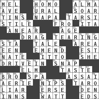 ACROSS 1. Cartoonist voice _ Blanc 4. Same (prefix) 8. _ mater 12. "___ Maria" 13. Mountain range 14. Fly high 15. Metal containers 17. California wine valley 18. Tarsus (plural) 19. Vertical member of a panel or frame 21. Away 23. Call ___ day 24. Approach 26. Mature 28. To draw with force 30. Lacerating 34. R.R. building 37. Story 39. Length times width 40. Car or cant ending 41. Make improvements or corrections to 43. Eastern Standard Time (abbr.) 44. Nathan's nickname 46. "Tell ____ the Marines!" 47. A female animal or person 48. Popular '50s hangout 51. Fastener 54. Shade tree 55. Clothes sense 58. Sis' sibling 61. Health resort 63. Slender Brazilian palm 65. Nest on high 67. Pinches, bites 71. Edible starchy tuberous root 72. One who doesn't tell the truth 73. Celtic language 74. Lair 75. Restaurants 76. Electrical Unit 77. Begley and Asner DOWN 1. Floor coverings 2. Webber/Rice musical 3. Soviet premier 1918-24 4. Attila the _ 5. Mouth or opening 6. Atlas unit 7. Norwegian king 8. White ___ sheet 9. Australian parrot (variant) 10. Vertical spar for supporting sails 11. Roberta Peters solo 16. Downhill vehicle 18. Ancient Roman robe 20. Ewer handle 22. Actress Charlotte 25. Assign a rank or rating to 27. Period 29. Homeless child 30. Portable shelters 31. Angers 32. Soft 33. Yard entry 34. Transmit 35. Pull apart 36. Against 38. Allow 42. Do not 45. Night before a holiday 49. Otherwise 50. Naughty child 52. American Automobile Association (abbr.) 53. Inconspicuous attention getter 56. Sadhe (variant) 57. Having ears or earlike features 58. Indonesian resort city 59. It's straight from the horse's mouth 60. Northwest Algerian city 62. Afresh 64. Charged atoms 66. Big collection agency 68. Retirement account (abbr.) 69. Pacific Standard Time (abbr.) 70. Arrange properly for use