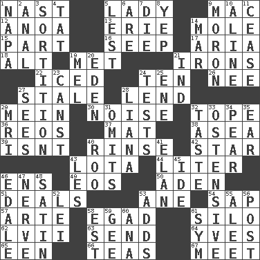 ACROSS 1. Political cartoonist Thomas 5. Kenny Rogers chart-topper in '80 9. Big _ 12. Small Philippine buffalo 13. One of the Great Lakes 14. Undercover agent 15. Role in a play 16. Ooze 17. Operatic vocal solo 18. The first octave above the treble staff 19. Was introduced to 21. Removes the wrinkles 22. On the rocks 24. "___ Little Indians" 26. Born 27. Having lost freshness 28. Grant temporary use of 29. Count _ (2 wds.) 30. Annoying sound 32. Drink excessively 36. Vintage cars 37. Floor covering 38. Toward the sea 39. Is not 40. Wash lightly 42. Play the lead 43. Globular water bottle used in Asia 44. 61 cubic inches 46. Followers of ems 49. Greek goddess of the dawn 50. An important port of Yemen 51. Allots cards 53. A saturated hydrocarbon 54. Plant excrement 57. Johnson of "Laugh-In" 58. Mild oath 61. Grain storage tower 62. 57 in ancient Rome 63. Post 64. Jacques Cousteau's middle name 65. Car or cant ending 66. Afternoon social gatherings 67. Confront DOWN 1. California wine valley 2. Of or related to the anus 3. Casting lots 4. Make lace 5. For fear that 6. "We ___ not amused" (Victoria) 7. Expire 8. Slangy assent 9. Person of subnormal intelligence 10. Place in a line 11. Stop 14. Third mo. 19. Cartoonist voice _ Blanc 20. Paradise 21. Working for oneself (abbr.) 23. 2nd pers. sing. pres. of can (arch.) 24. Trials 25. Compass dir. 27. Perceives with the eye 28. Woody, climbing, usually tropical plant 29. Medical imaging device (abbr.) 31. Leaves out 32. Clothes sense 33. Clearly or manifestly demonstrative 34. Lightbulb-shaped fruit 35. Hearing organ 40. Friend of Pooh 41. Liveliness 43. French article 45. Binary compound 46. Peak District village in England 47. Impudent aggressiveness 48. Smooth fabric 52. Luau accessory 53. Does sums 55. Toward shelter 56. Mail 58. Eastern Standard Time (abbr.) 59. Unit of force equal to gravity 60. Santa ___, CA 61. Symbol (abbr.)