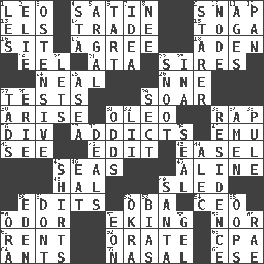 ACROSS 1. Lion 4. Smooth fabric 9. Fastener 13. Raised railways 14. Barter 15. Ancient Roman robe 16. Be seated 17. Match 18. Arabian gulf 19. Snakelike fish 21. "One Day ___ Time" 22. Fathers 24. Be tempered by heat 26. Compass dir. 27. Trials 29. Fly high 30. Get up 31. Butter sub 33. Strike 36. HTML Container Element 37. Inveterate users 40. Australian flightless bird 41. Perceive with the eye 42. Prepare for publication 43. Artist's stand 45. Oceans 47. Place in a line 48. Actor Linden 49. Downhill vehicle 50. Proofreads 52. Chief or king in Benin or Nigeria 54. Corporate head (abbr.) 56. Scent 57. Supplementing with great effort 59. And not 61. Monthly bill 62. Speak pompously 63. Numbers guy (abbr.) 64. Pismires 65. Rhinal 66. Compass dir. DOWN 1. French article 2. Writer Wiesel 3. Clearly or manifestly demonstrative 4. R.R. building 5. Therefore, facetiously 6. Small pie 7. It may be bright or harebrained 8. Born 9. A viewer who gazes fixedly 10. Connecting point 11. Matures 12. Baking dish 20. Allows 22. Snout, nose 23. _ tizzy (2 wds.) 25. Toward the sea 27. Small amounts or degrees 28. 4th largest of the Great Lakes 29. Religious group 31. Likelihood 32. Cards in a Roman deck? 33. Home 34. So be it 35. Whimper 38. Allots cards 39. Lick closed 44. Actor Baldwin 45. Chest coverings 46. Erode 49. Before Barbara or Clara 50. Genesis locale 51. Do not 52. Gumbo ingredient 53. Prejudice 55. I made a mistake 56. Mouth or opening 57. A really long time 58. Set 60. Actress Charlotte