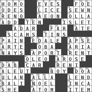 ACROSS 1. Same (prefix) 5. Nights before holidays 9. Enemy 12. Lyric poems 13. Louse (plural) 14. Stitched 15. Western Nevada city 16. A really long time 17. Water jar 18. Find the sum of 19. "___ Little Indians" 21. Small island 22. The sixth month of the Jewish calendar 24. Distant 26. Had dinner 27. Fraudulent business schemes 28. Canisters 29. Ache 30. Peak District village in England 32. Domed church section 36. Johnson of "Laugh-In" 37. Chief or king in Benin or Nigeria 38. Operatic vocal solo 39. Negative votes 40. To the left, to Queeg 42. Monthly bill 43. Margarine 44. Came up 46. Apply (a substance) by light strokes 49. Automobile 50. Painter Guido (1575-1642) 51. Native American of Southwest Alaska 53. Male child 54. ___ good deed 57. Uhlan (variant) 58. Silent film actress Nazimova 61. Grant temporary use of 62. Indonesian resort city 63. Christmas carol 64. South American Indian 65. A female animal or person 66. Tiny particle 67. A whole individual unit DOWN 1. Israeli folk dance 2. Wrote a lyric poem 3. Ananias' fault 4. Bear (Spanish) 5. Liveliness 6. Compete 7. Environmental prefix 8. Elected rep. 9. Chap (slang) 10. A small or young owl 11. Related on the mother's side 14. Mayday 19. Scottish cap 20. Celtic language 21. Big collection agency 23. Natives or inhabitants of Denmark 24. Having threads 25. One (Scot) 27. "Two Mules for Sister ____" 28. Off limits 29. Baking dish 31. Drug addict 32. Composer Copland 33. Elected leader of a country 34. Trig term 35. Ingest 40. Wing 41. Edible starchy tuberous root 43. Sep. follower 45. Marina Del _, California 46. Applies to a surface 47. Assad's deity 48. Memphis, Tenn. Street 52. University (slang) 53. Lip ointment 55. Single time 56. First man 58. Santa ___, CA 59. Car dealer's back yard 60. Lion 61. Cards in a Roman deck?