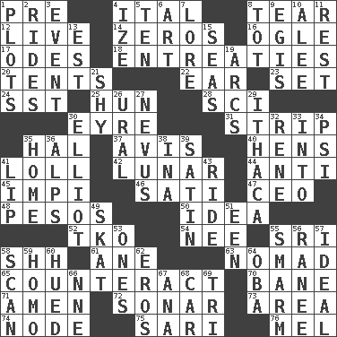 ACROSS 1. Before (prefix) 4. Slanted text style (abbr.) 8. Lacerate 12. Moving, as bait 14. Nothings 16. Stare at amorously 17. Lyric poems 18. Pleas 20. Portable shelters 22. Ewer handle 23. Arrange properly for use 24. Fast jet (abbr.) 25. Attila the _ 28. _-fi 30. Jane of fiction 31. Long narrow piece of something 35. Actor Linden 37. Opinion 40. Coop moms 41. Hang loosely or laxly 42. Type of eclipse 44. Opposed to 45. Body of Kaffir warriors 46. Suttee (variant) 47. Corporate head (abbr.) 48. Mexican monetary units 50. The main thing one is thinking about 52. Ring climax 54. Born 55. _ Lanka 58. Quiet! 61. A saturated hydrocarbon 63. Roamer 65. Neutralize 70. Object of repulsion 71. So be it 72. Underwater navigation system 73. Type of rug 74. Thickened enlargement 75. Indian skirt 76. Cartoonist voice _ Blanc DOWN 1. Small pieces of grounds 2. Amusement-park features 3. Happening 4. Ending with capital 5. "___ Little Indians" 6. Tate display 7. Old wives' tales, e.g. 8. Small child 9. The front part of a cuirass 10. Toward shelter 11. Remainder 13. Eastern Standard Time (abbr.) 15. Oceans 19. Curves 21. Like a shrinking violet 26. Mountain range 27. Congenital growth or mark on the skin 29. New York city 30. American author Paul (1891-1958) 32. French philosopher Descartes 33. To the inside or interior of 34. Air pressure measure (abbr.) 35. Residence 36. High mountains 38. _ tizzy (2 wds.) 39. Smooth fabric 41. Mouth edge 43. Travel on an animal 49. Three-handed card game 51. Car or cant ending 53. Washington bills 55. Excessive but superficial compliments 56. The wife of a rajah (variant) 57. Standard of perfection 58. Examine minutely or intensely 59. Same (prefix) 60. Took on color 62. Greek god of love 64. Chief or king in Benin or Nigeria 66. Compass dir. 67. Santa ___, CA 68. 4-wheeled motor vehicle 69. Three (prefix)