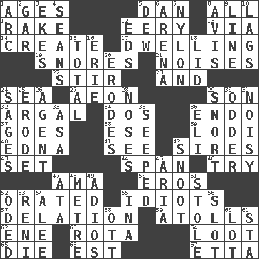 ACROSS 1. Grows older 5. Daniel's nick name 8. Everything 11. Libertine 12. Suggestive of the supernatural 13. By way of 14. Cause to be 17. Residence 19. Sounds asleep 21. Annoying sounds 22. Commotion 23. Plus 24. Ocean 27. A really long time 29. Boy, to dad 32. Therefore, facetiously 34. Two (Sp.) 36. Inside; within (prefix) 37. Leaves 38. Compass dir. 39. Farming town in central California 40. Pulitzer Prize-winning author Ferber 41. Perceive with the eye 42. Begets 43. Put into a specified state 44. Connect, as a bridge 46. Attempt to accomplish something 47. Nanny (var.) 50. Greek god of love 52. Spoke pompously 55. Foolish or stupid persons 57. Accusation by an informer 59. Ringlike coral islands and reefs 62. Compass dir. 63. Round or rotation of duties 64. Plunder 65. Pass on 66. Eastern Standard Time (abbr.) 67. Singer James DOWN 1. Curve 2. Slender fish 3. Supplements with great effort 4. Actors Connery and Penn 5. Morning condensation 6. Sports stadium 7. Thermoplastic polyamide 8. Deliberation 9. Actor's bit 10. Straggles 12. Begley and Asner 15. "_____ Recall" 16. One of the Great Lakes 18. Flaplike covering 20. Eats (away) 24. Gurus 25. Eat (away) 26. Representative 28. Olfactory organs 29. Derisive sound 30. More peculiar 31. Annoyingly loud 33. White ___ sheet 35. Oozed 36. Biblical high priest 42. Snout, nose 45. Operatic vocal solo 47. "One Day ___ Time" 48. Distance measurement (Brit.) 49. Goodbye (Sp.) 51. Fur scarf 52. Wrote a lyric poem 53. Painter Guido (1575-1642) 54. Toward shelter 55. _ tizzy (2 wds.) 56. Narrow opening 58. Baseball player Mel 60. Car dealer's back yard 61. R.R. building