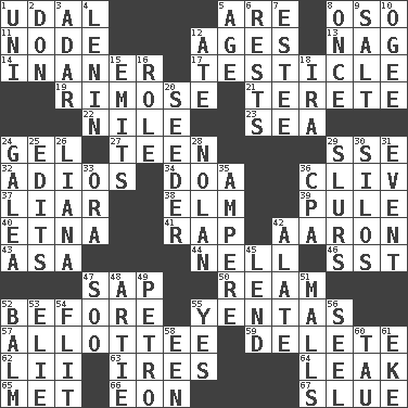 ACROSS 1. Allodial 5. "We ___ not amused" (Victoria) 8. Bear (Spanish) 11. Connecting point 12. Grows older 13. Tired old horse 14. More empty; more void 17. A testis 19. Full of chinks, cracks, or crevices 21. Cylindrical with tapered ends 22. The longest river in the world 23. Ocean 24. Set 27. Adolescent 29. Compass dir. 32. Goodbye (Sp.) 34. ___ good deed 36. 154 in Roman numerals 37. One who doesn't tell the truth 38. Shade tree 39. Whimper 40. Inactive volcano in Sicily 41. Strike 42. Composer Copland 43. White ___ sheet 44. 1994 drama film starring Jodie Foster 46. Fast jet (abbr.) 47. Plant excrement 50. 480, 500 or 516 sheets of paper 52. Prior to 55. Gossips 57. One to whom something is allotted 59. Keyboard key 62. Cards in a Roman deck? 63. Angers 64. Path through which fluid escapes 65. Was introduced to 66. A really long time 67. Change direction abruptly DOWN 1. Single; one (prefix) 2. Spanish title 3. The sixth month of the Jewish calendar 4. Soviet premier 1918-24 5. Ripen 6. Musical pauses 7. First name in cosmetics 8. At one time in the past 9. Table seasoning 10. Double curve, resembling the letter S 12. Had dinner 15. Gives off 16. Hero or heavy, e.g. 18. Retirement account (abbr.) 20. Sowing specialist 24. An organ shaped like a helmet 25. Prepares for publication 26. Climbing, woody, usually tropical vines 28. Pitcher Ryan 29. Runs notes together 30. Grain storage towers 31. Incident 33. Mouth or opening 35. Electrical Unit 36. Numbers guy (abbr.) 42. Having winglike extensions 45. Grant temporary use of 47. "Barney Miller" actor Jack 48. Nick name for Arthur 49. Stone: prefix 51. Promenades 52. Lip ointment 53. Writer Wiesel 54. Secret move to avoid paying debts 55. Affirmative reply 56. Stitch closed the eyes of (a falcon) 58. Car or cant ending 60. The 19th letter of the Greek alphabet 61. Supplement with great effort