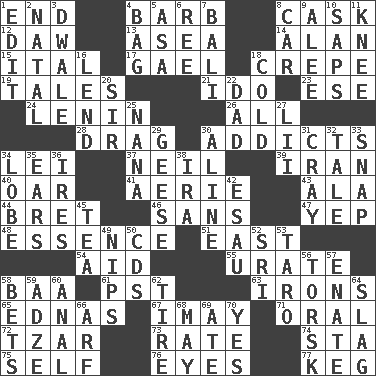 ACROSS 1. Conclusion 4. Sharp remark 8. Keg 12. Simpleton 13. At sea 14. ____ Jay Lerner 15. Slanted text style (abbr.) 17. Highlander 18. Streamer paper 19. Falsehoods 21. Wedding promise 23. Compass dir. 24. Soviet premier 1918-24 26. Everything 28. To be drawn or hauled along 30. Inveterate users 34. Luau accessory 37. Famous astronaut Armstrong 39. SW Asia republic 40. Boat paddle 41. Nest on high 43. According to 44. Cy Young winner Saberhagen 46. Without 47. Slangy assent 48. Center 51. 90 degrees 54. Help 55. A salt of uric acid 58. Sound made by sheep 61. Pacific Standard Time (abbr.) 63. Removes the wrinkles 65. Ferber et al. 67. "If ____ say so..." 71. Taken by mouth 72. Czar 73. Pace 74. R.R. building 75. Automatically 76. Sight organs 77. Cask DOWN 1. Prepare for publication 2. Brizilian seaport 3. A sleeping potion; an opiate (poet.) 4. Container for groceries 5. White ___ sheet 6. Portuguese money of account (variant) 7. Indonesian resort city 8. Automobile 9. Toward shelter 10. Plant excrements 11. Leg joint 16. Grant temporary use of 18. Chilled 20. Title for a knight 22. June honoree 25. Grandmother 27. Cards in a Roman deck? 29. Honkers 30. Place in a line 31. Supercomputer manufacturer 32. Story 33. Fastener 34. Ear part 35. Hearing organs 36. Angers 38. Retirement account (abbr.) 42. Son of Isaac 45. Afternoon social gathering 49. Pinches, bites 50. Music discs 52. _ Lanka 53. Edible starchy tuberous root 56. Cod relative 57. Related on the mother's side 58. Antes 59. Axlike tool, used for shaping wood 60. Of or related to the anus 62. Hoop that covers a wheel 64. Volcanic refuse 66. Sandy's bark 68. Fifth month 69. Had dinner 70. Affirmative reply
