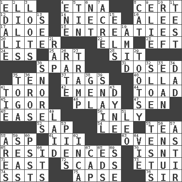 ACROSS 1. Pipe bend 4. Inactive volcano in Sicily 8. Sure thing 12. "Vaya con ____" 14. Sibling's daughter 16. Toward shelter 17. _ vera 18. Pleas 20. 61 cubic inches 22. Shade tree 23. Newt 24. Curvy letter 25. Nonscientific branch of learning 28. Be seated 30. Practice fight 31. Administered medicine 35. "___ Little Indians" 37. Labels 40. Rounded earthenware pot or jar 41. "Corrida" creature 42. Make improvements or corrections to 44. Frog relative 45. Russian composer Stravinsky 46. Romp 47. Elected rep. 48. Artist's stand 50. Inwardly 52. Plant excrement 54. Area sheltered from the wind 55. Afternoon social gathering 58. Cleo's killer 61. One more than two 63. Baking chambers 65. Homes 70. Is not 71. 90 degrees 72. Tons 73. Needle holder 74. Fast planes 75. Domed church section 76. Title for a knight DOWN 1. Peak District village in England 2. Ms. Damita and namesakes 3. Plunders 4. Compass dir. 5. Shallow baking pan 6. Fish or hair follower 7. Land measure 8. Domesticated feline 9. Writer Wiesel 10. Coral ridge 11. Trial 13. Perceive with the eye 15. Snakelike fish 19. Among 21. Strike 26. Assign a rank or rating to 27. _____ steamer (cargo ship) 29. Tootsie (variant) 30. Sounds asleep 32. _ gin 33. Liveliness 34. June honoree 35. Ancient Roman robe 36. Greek god of love 38. Set 39. Slow-paced one 41. Make a knot 43. Centimeter-gram-second unit of force 49. Put down 51. Lion 53. Sliced desserts 55. Trials 56. World-weariness 57. Moving or stirring 58. Ancient Greek god of war 59. Oceans 60. Inconspicuous attention getter 62. South American Indian 64. Compete 66. ___ a Wonderful Life 67. Head covering 68. Begley and Asner 69. Compass dir.