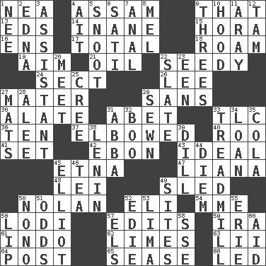 ACROSS 1. Teachers' org. 4. Indian state 9. Not this but _ 13. Begley and Asner 14. Silly 15. Israeli folk dance 16. Followers of ems 17. Add up to 18. Wander aimlessly 19. Direct toward a target or goal 21. Petroleum 22. Shabby and untidy 24. Religious group 26. Area sheltered from the wind 27. Mother 29. Without 30. Having winglike extensions 31. Collude with 33. Affectionate concern, for short 36. Nine, plus one 37. Turned at an angle; bent 40. Friend of Pooh 41. Put into a specified state 42. Inky black, to poets 43. Standard of perfection 45. Inactive volcano in Sicily 47. Woody, climbing, usually tropical plant 48. Flowery wreath 49. Downhill vehicle 50. Pitcher Ryan 52. Connecticut Ivy Leaguer 54. Madame (abbr.) 56. Farming town in central California 57. Prepares for publication 59. Retirement account (abbr.) 61. Southeast Asian peninsula 62. Citrus fruits 63. Cards in a Roman deck? 64. Mail 65. Gospel singer Marvin 66. Directed DOWN 1. Born 2. Pulitzer Prize-winning author Ferber 3. Aide 4. Small island 5. Snout, nose 6. Suttee (variant) 7. Of or related to the anus 8. Cartoonist voice _ Blanc 9. Threesomes 10. Parka part 11. Like ___ of sunshine 12. Scottish cap 20. Confront 22. Chalkboard 23. Car or cant ending 25. Algonquian 27. Floor protectors 28. Toward shelter 29. Stitched 31. Swedish rock group 32. Surprise greeting 33. Excercise machine 34. Grant temporary use of 35. Root beer relative 38. Soviet premier 1918-24 39. Deli pickle 44. South Vietnam president (1954) 45. American author Paul (1891-1958) 46. Afternoon social gathering 49. Settings 50. Words to Nanette 51. Likelihood 52. Singer Brickell 53. Pale green bean 55. 4th largest of the Great Lakes 56. Mouth edge 57. Raised railways 58. Compass dir. 60. Help