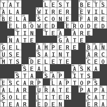 ACROSS 1. Make lace 4. For fear that 8. Antes 12. Wing 13. One who wires 14. Morally bad or wrong 15. Actor Lugosi 17. Biscuitlike quick bread 18. Conductor's collection 19. Turned at an angle; bent 21. Eaten away 23. Metal container 24. Afternoon social gathering 26. "We ___ not amused" (Victoria) 27. Nathan's nickname 28. Yard entry 30. Set 31. Electrical Unit 34. Prohibit 37. Purpose 38. Inhabitant of Heaven 39. Curve 40. Mountains (abbr.) 41. Keyboard key 42. Corporate head (abbr.) 43. Lick closed 44. "____ silly question..." 46. R.R. building 47. Plant excrement 50. ___ a Wonderful Life 51. Fortification 54. Portable computers 57. Having or resembling wings 58. A salt of uric acid 60. Dad 62. Flatfish 63. 61 cubic inches 64. Domesticated feline 65. Separate forcefully 66. Genesis locale 67. Period DOWN 1. Bar bill 2. Toward shelter 3. Baron Munchausen's specialties 4. It is permitted: Lat. 5. Eat (away) 6. Elected rep. 7. Woody plant 8. Prior to 9. Dodge 10. Become fatigued 11. Downhill vehicle 13. Compass dir. 16. "This won't hurt ____!" 20. Single 22. Pace 25. Representative 27. A home for chicks 29. Johnson of "Laugh-In" 30. Chewing product 31. At sea 32. Shopping centers 33. Sliced dessert 34. Keyboard key 35. Length times width 36. Non-commissioned officer (abbr.) 41. Letter starter 43. A viewer who gazes fixedly 44. Small island 45. Discontinue 46. Any of the three canals of the cochlea 48. Having winglike extensions 49. Eucharist need 51. 90 degrees 52. A type of plum 53. Whine 55. For each 56. Coast Guard woman 59. To free from 61. _ moment's notice (2 wds.)