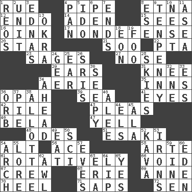 ACROSS 1. Regret 4. Corncob 8. Inactive volcano in Sicily 12. Inside; within (prefix) 14. Arabian gulf 15. Observes 16. Pig sound 17. Unrelated to defense, as in spending 20. Play the lead 21. "Barney Miller" actor Jack 22. Parent Teacher Association (abbr.) 23. Gurus 27. Olfactory organ 29. Hearing organs 31. Leg joint 34. Nest on high 35. Restaurants 36. Brightly colored fish 39. Ocean 41. Snake ____ (dice throw) 42. Cause heat under the collar 43. Entreaties 46. Actor Lugosi 47. Shout 48. Lyric poems 51. 1973 Nobel Price Winner (Physics) Leo 54. The first octave above the treble staff 56. Adept person 58. Johnson of "Laugh-In" 61. Rotating or pertaining to rotation 66. Lacking any legal or binding force 67. Ship's personnel 68. One of the Great Lakes 69. Queen of England 1702-14 70. Person who is morally reprehensible 71. Plant excrements 72. Elected rep. DOWN 1. Vintage cars 2. A single undivided whole 3. Ferber et al. 4. Baking dish 5. Wedding promise 6. Writing instrument 7. Extremities 8. Compass dir. 9. 3-inch nail 10. A home for chicks 11. At sea 13. Gumbo ingredient 18. Period of immesurable duration 19. Egg _ yung 24. Turn to the right 25. Ewer handle 26. Indian titles of respect 28. Atmospheres 30. Oozy 32. Compass dir. 33. Curvy letter 34. At or in the front 36. Globe 37. Sliced dessert 38. One to whom something is allotted 40. Toward shelter 44. Raised railways 45. According to 49. Ingest 50. _-fi 52. Polynesian shrub of the pepper family 53. Removes the wrinkles 54. Bowlike part 55. Old wives' tales, e.g. 57. Nights before holidays 59. Prong on a fork 60. Genesis locale 62. Leather borer 63. Period 64. Mouth edge 65. It is so