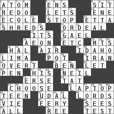 ACROSS 1. Tiny particle 5. Followers of ems 8. Be seated 11. Redecorate 12. Allows 14. Compass dir. 15. Learning spot: Fr. 17. Discontinue 18. Singer James 19. Tears up 21. Severe or trying experience 23. ___ a Wonderful Life 25. Highlander 26. Period of immesurable duration 27. And so on (abbr.) 28. Mountains (abbr.) 31. Actor Linden 33. Wind 35. Potato state 37. Pale green bean 38. Plant holder 40. SW Asia republic 41. Unconcealed 43. Benjamin's nick name 45. Allow 46. Writing instrument 47. Part of HMS, perhaps 50. Famous astronaut Armstrong 52. Celtic language 53. Make lace 54. Elect 56. Portable computer 61. Adolescent 62. Hereditary estate 65. Titled peers of a realm 66. Compete 67. Suggestive of the supernatural 68. Observes 69. Everything 70. To sift 71. Trial DOWN 1. Ancient Greek god of war 2. Technical work 3. Aroma 4. Undercover agent 5. Raised railways 6. Fish or hair follower 7. Moe Howard, for one 8. Stalk of a moss capsule 9. International (abbr.) 10. Afternoon social gathering 13. Small fatty European fish 16. Singer Brickell 18. Snakelike fish 20. Portico 22. Tenth: prefix 24. Sever or remove by pinching or nipping 26. Having or resembling wings 28. Female horse 29. Not this but _ 30. Male offspring 31. Hub of activity 32. So be it 34. Director Reiner 36. Deli pickle 37. Trim (branches) 39. Portable shelter 42. Through, poetically 44. Actress Patricia 48. Come out of 49. Sowing specialist 51. Slanted text style (abbr.) 52. A really long time 54. To provide with a ceiling 55. The bottom of a shoe or boot 57. Mail 58. Woody plant 59. Lyric poems 60. Inconspicuous attention getter 61. Federal power corp. 63. "We ___ not amused" (Victoria) 64. Potassium hydroxide