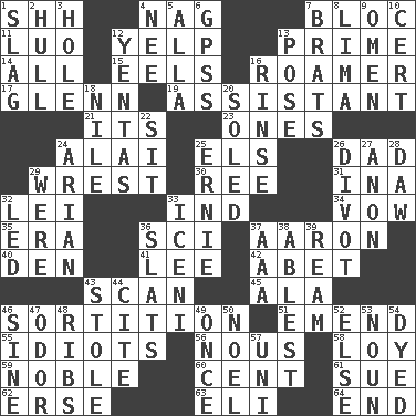 ACROSS 1. Quiet! 4. Tired old horse 7. Coalition 11. Nilotic language 12. Sharp bark 13. A-one 14. 100% 15. Snakelike fish 16. Wanderer 17. American astronaut and politician John 19. Aide 21. ___ a Wonderful Life 23. Singles 24. Jai _ 25. Raised railways 26. June honoree 29. Take or capture by force 30. To riddle 31. _ tizzy (2 wds.) 32. Flowery wreath 33. Working for oneself (abbr.) 34. Promise 35. Epoch 36. _-fi 37. Composer Copland 40. Lair 41. Area sheltered from the wind 42. Collude with 43. Examine hastily 45. According to 46. Decision 51. Make improvements or corrections to 55. Foolish or stupid persons 56. Good sense 58. Myrna of the movies 59. Impressive in appearance 60. Penny 61. Take to court 62. Celtic language 63. Biblical high priest 64. Conclusion DOWN 1. Volcanic refuse 2. Frame or body of a ship 3. Hollow 4. Born 5. Silent film actress Nazimova 6. Global Positioning Systems (abbr.) 7. Naughty children 8. Pale green bean 9. Presage 10. Sure thing 12. Gossips 13. Airs 16. Remove soap 18. Mediterranean tributary 20. Having a sole or soles 22. Be seated 24. Believer in; advocate of (suffix) 25. Bert's buddy 26. A piece of turf (Scot.) 27. Soon (poet.) 28. Obsolete 29. We are 32. Directed 33. Ancient Celtic tribe of eastern Britain 36. Narrow boards 37. American Automobile Association (abbr.) 38. Most capable 39. 480, 500 or 516 sheets of paper 43. Took without asking 44. Quote 46. Trig term 47. Scent 48. Teases 49. At one time in the past 50. Christmas carol 52. Otherwise 53. Part of speech 54. Colored 57. Single; one (prefix)