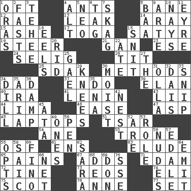 ACROSS 1. Often (poetically) 4. Pismires 8. Object of repulsion 12. Actress Charlotte 13. Path through which fluid escapes 14. Like ___ of sunshine 15. American tennis player Robert 17. Ancient Roman robe 18. Man with strong sexual desires 19. Guide 21. Separate the seeds from cotton 23. Compass dir. 24. Major League Baseball Commissioner Bud 26. Teat (slang) 28. Neighbor of Neb. 30. Modes 34. Male parent 37. Inside; within (prefix) 39. Liveliness 40. Retirement account (abbr.) 41. Soviet premier 1918-24 43. Cards in a Roman deck? 44. Pale green bean 46. Comfort 47. Cleo's killer 48. Portable computers 51. Russian ruler of old 54. One (Scot) 55. Marketplace scale 58. Order of Saint Francis (abbr.) 61. Followers of ems 63. Dodge 65. Aches 67. Sums up 71. Dutch treat 72. Prong on a fork 73. Vintage cars 74. Connecticut Ivy Leaguer 75. Highlander 76. Queen of England 1702-14 77. Arrange properly for use DOWN 1. Mouths or openings 2. Goes without food and/or water 3. Giggle 4. The first octave above the treble staff 5. Modern: prefix 6. Label 7. Heroin 8. Sound made by sheep 9. Johnson of "Laugh-In" 10. Negative votes 11. Jane of fiction 16. Snakelike fish 18. In a ____ (agitated or irritated) 20. To free from 22. Had dinner 25. Highlander 27. Definite Article 29. Leg joints 30. Wet 31. Spanish pot 32. Raised platform 33. Clip 34. Deli pickle 35. Operatic vocal solo 36. Moist 38. Heredity factor (abbr.) 42. A home for chicks 45. _ moment's notice (2 wds.) 49. Washington bills 50. Writing instrument 52. "We ___ not amused" (Victoria) 53. Hero or heavy, e.g. 56. Unclothed pictures 57. Peak District village in England 58. Chooses 59. Ketch in the Levant 60. A pale, very dry sherry 62. "Two Mules for Sister ____" 64. Give off 66. Fish or hair follower 68. Lair 69. Spanish title 70. Compass dir.