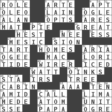 ACROSS 1. Hero or heavy, e.g. 5. Johnson of "Laugh-In" 9. Fitting 12. Margarine 13. (Had) reclined 14. Stare 15. ____ Jay Lerner 16. Chooses 17. Ancient Greek god of war 18. Floor protector 19. Sliced dessert 21. Relatively large 22. Behest 24. Born 26. Double-curved letter 27. Of or pertaining to a meson 28. The Jewish people; Israel 29. Small pie 30. Dwellings 32. Operatic vocal solo 36. Double curve, resembling the letter S 37. Big _ 38. Australian parrot (variant) 39. Periodic rise and fall of the sea level 40. One who wires 42. On the rocks 43. Electrical Unit 44. Pig sounds 46. R.R. building 49. Big collection agency 50. Family _ (genealogy) 51. Small house or cottage 53. American Automobile Association (abbr.) 54. "___ Little Indians" 57. Among 58. Give a ring to 61. Pale green bean 62. Ancient Persian 63. Tiny particle 64. A single undivided whole 65. Compass dir. 66. Dad 67. Legendary monster DOWN 1. Wander aimlessly 2. Rounded earthenware pot or jar 3. Resembling or made to resemble leather 4. Period of immesurable duration 5. Medicinal plant 6. Strike 7. Teat (slang) 8. Followers of ems 9. Match 10. Entreaties 11. Trials 14. Rowing implement 19. 23rd letter of the Greek alphabet 20. Hankering 21. Commissioned military rank (abbr.) 23. First name in cosmetics 24. Sibling's daughter 25. Greek goddess of the dawn 27. Wise men 28. Don Adams' spy role 29. Small child 31. Leaves out 32. Place in a line 33. Shooting up abruptly 34. Angers 35. Assist 40. Armed conflict 41. Roll call or roster of names 43. Acquire through effort 45. Retirement account (abbr.) 46. Fraudulent business schemes 47. Softens 48. Remain 52. Binary compound 53. _ mater 55. Arab leader 56. Nathan's nickname 58. Head covering 59. _ moment's notice (2 wds.) 60. Trim (branches) 61. Nilotic language