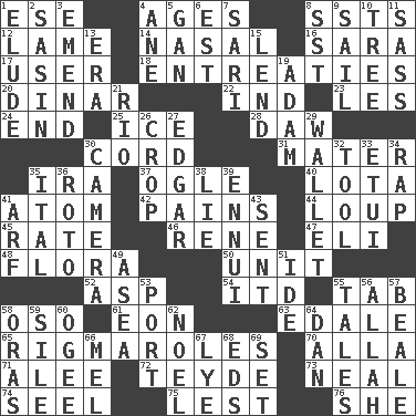 ACROSS 1. Compass dir. 4. Matures 8. Fast planes 12. Unable to walk 14. Rhinal 16. "Two Mules for Sister ____" 17. One who uses or employs something 18. Pleas 20. Middle Eastern gold or silver currency 22. Working for oneself (abbr.) 23. French article 24. Conclude 25. Frozen water 28. Simpleton 30. Drawstring 31. Mother 35. Retirement account (abbr.) 37. Stare 40. Globular water bottle used in Asia 41. Smallest unit of an element 42. Aches 44. Central Nebraska county 45. Assign a rank or rating to 46. French philosopher Descartes 47. Connecticut Ivy Leaguer 48. Plants 50. A single undivided whole 52. Cleo's killer 54. It would 55. Keyboard key 58. Bear (Spanish) 61. A really long time 63. Peak District village in England 65. Complicated, petty procedures 70. Silent film actress Nazimova 71. Toward shelter 72. Miss Universe 1986, Barbara Palacios _ 73. Be tempered by heat 74. Stitch closed the eyes of (a falcon) 75. For fear that 76. A female animal or person DOWN 1. Evade 2. Indian antelope 3. Make improvements or corrections to 4. One (Scot) 5. Separate the seeds from cotton 6. Eastern Standard Time (abbr.) 7. Indian skirt 8. Fast jet (abbr.) 9. Travel by water 10. Relationship diagram 11. Backtalk 13. Period 15. Grant temporary use of 19. First man 21. _ de Janeiro 26. Riding implement 27. _ Allan Poe 29. Place for singles 30. Device for capturing images 32. Instrument 33. Needle case 34. Reproach for some lapse or misdeed 35. Slanted text style (abbr.) 36. Printing process, for short 38. Whopper 39. World-weariness 41. Sandy's bark 43. Posted 49. At sea 51. Binary compound 53. Sweet dark-red dessert wine 55. Stories 56. Assad's deity 57. Memphis, Tenn. Street 58. Mouths or openings 59. Drop; flow; fall 60. Double curve, resembling the letter S 62. Christmas carol 64. Daniel's nick name 66. Cartoonist voice _ Blanc 67. Sodium hydroxide 68. Begley and Asner 69. Arrange properly for use