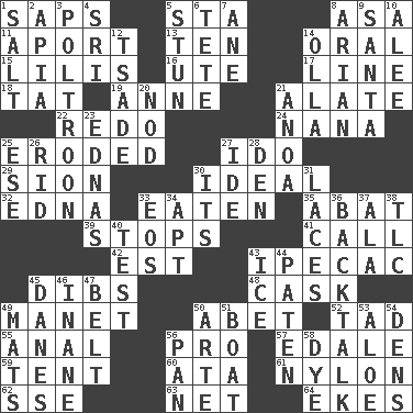 ACROSS 1. Plant excrements 5. R.R. building 8. White ___ sheet 11. To the left, to Queeg 13. "___ Little Indians" 14. Taken by mouth 15. Ms. Damita and namesakes 16. Shoshoni 17. Actor's bit 18. Make lace 19. Singer Murray 21. Having winglike extensions 22. Redecorate 24. Grandmother 25. Eaten away 27. Wedding promise 29. The Jewish people; Israel 30. Standard of perfection 32. Pulitzer Prize-winning author Ferber 33. Eroded 35. Blind as ____ 39. Obstructs or blocks passage 41. Give a ring to 42. Eastern Standard Time (abbr.) 43. Medicinal drug used to evoke vomiting 45. Claim 48. Keg 49. French painter Edouard 50. Collude with 52. Small boy 55. Of or related to the anus 56. Adept person 57. Peak District village in England 59. Portable shelter 60. _ moment's notice (2 wds.) 61. High-strength synthetic material 62. Compass dir. 63. Remaining after all deductions 64. Makes supply last DOWN 1. Table seasoning 2. Capital of Western Samoa 3. Characterized by complete cowardliness 4. Indian title of respect (Mr.) 5. Astound 6. Wig 7. One (Scot) 8. Believer in; advocate of (suffix) 9. Before Barbara or Clara 10. Toward shelter 12. Sadhe (variant) 14. Spanish pot 20. Allow head to fall sleepily 21. Small Philippine buffalo 23. Ferber et al. 25. Compass dir. 26. To free from 27. Binary compound 28. Lair 30. It is 31. Shoestrings 33. Greek goddess of the dawn 34. Fitting 36. Sass 37. Chicken ___ king 38. Affectionate concern, for short 40. Trial 43. Frozen water 44. Eucharist need 45. Natives or inhabitants of Denmark 46. Empty; void 47. Waist strap 49. Floor protectors 50. Johnson of "Laugh-In" 51. Water vessel 53. _ vera 54. Habitations of wild animals 56. Baking dish 58. Color