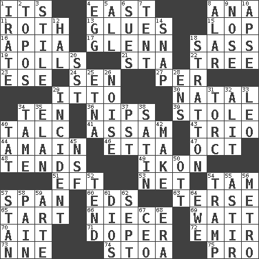 ACROSS 1. It is 4. 90 degrees 8. Santa ___, CA 11. Writer of Portnoy's Complaint (1969) 13. Cements 15. Chop off 16. Capital of Western Samoa 17. American astronaut and politician John 18. Backtalk 19. For Whom the Bell _____ 21. R.R. building 22. Family _ (genealogy) 23. Compass dir. 24. Elected rep. 27. For each 29. "Tell ____ the Marines!" 30. Relating to or accompanying birth 34. "___ Little Indians" 36. Pinches, bites 39. Took without asking 40. Baby powder 41. Indian state 43. Musical group of three 44. With great haste 46. Singer James 47. Sep. follower 48. Watches over 49. Image 51. Lizard (obsolete) 53. Fish or hair follower 54. Scottish cap 57. Connect, as a bridge 60. Begley and Asner 63. Laconic 65. Small pie 66. Sibling's daughter 69. Electrical Unit 70. Small island 71. Drug addict 72. Arab leader 73. Compass dir. 74. Portico 75. Adept person DOWN 1. Feeling or showing extreme anger 2. Literary convention 3. Vertical member of a panel or frame 4. Oval reproductive body of a fowl 5. 100% 6. Takes to court 7. Portable shelter 8. Having or resembling wings 9. Sense of smell 10. Domed church section 12. Actor Linden 14. Fastener 18. Ski resort town in Vermont 20. Fast jet (abbr.) 25. Inactive volcano in Sicily 26. Annoying sound 28. Followers of ems 29. Happening 31. Torque (variant) 32. Came down and settled, as after flight 33. Lion 34. Not wild 35. Style 37. Pacific Standard Time (abbr.) 38. Smooth fabric 40. Make lace 42. Create 45. Science/research agcy. 50. Baseball player Mel 52. Look after 54. _____ steamer (cargo ship) 55. Moving about 56. Paris' subway 57. Comedian Laurel of Laurel & Hardy 58. Ache 59. Johnson of "Laugh-In" 61. "Vaya con ____" 62. Back-to-school mo. 64. She-sheep 67. Corporate head (abbr.) 68. Period
