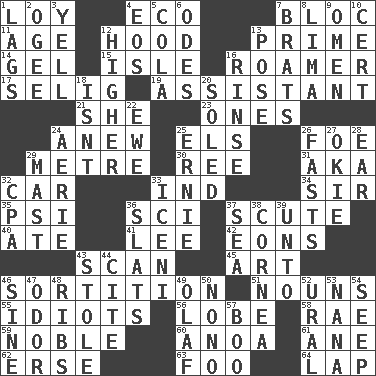 ACROSS 1. Myrna of the movies 4. Environmental prefix 7. Coalition 11. Mature 12. Parka part 13. A-one 14. Set 15. Capri or Wight 16. Wanderer 17. Former Milwaukee Brewers owner Bud 19. Aide 21. A female animal or person 23. Washington bills 24. Afresh 25. Raised railways 26. Enemy 29. Distance measurement (Brit.) 30. Portuguese money of account (variant) 31. Alias (abbr.) 32. 4-wheeled motor vehicle 33. Indiana (abbr.) 34. Title for a knight 35. 23rd letter of the Greek alphabet 36. _-fi 37. Snake scale 40. Had dinner 41. Area sheltered from the wind 42. Immeasurably long periods of time 43. Skim 45. Tate display 46. Decision 51. Parts of speech 55. Foolish or stupid persons 56. Ear part 58. Actress Charlotte 59. Having high moral qualities 60. Small Philippine buffalo 61. One (Scot) 62. Celtic language 63. Egg _ yung 64. Pet locale DOWN 1. Fails to keep up a pace 2. Double curve, resembling the letter S 3. Shout 4. Greek goddess of the dawn 5. Root beer relative 6. Lyric poems 7. Naughty children 8. Pale green bean 9. Sign of something about to happen 10. Sure thing 12. Having greater elevation 13. Introduce or present, as a question 16. Remove soap 18. Is not 20. Having a sole or soles 22. She-sheep 24. Nest on high 25. Bert's buddy 26. Goes without food and/or water 27. Migrant worker of the '30s 28. Ewer handle 29. Vertical spar for supporting sails 32. Numbers guy (abbr.) 33. Ancient Celtic tribe of eastern Britain 36. Narrow boards 37. Ocean 38. Pupil covering 39. To (old English) 43. Took without asking 44. Quote 46. Trig term 47. Aroma 48. Teases 49. Norwegian king 50. Words to Nanette 52. Mountain range 53. Nanny 54. Ooze 57. Surprise greeting
