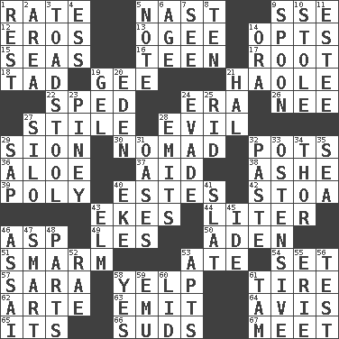 ACROSS 1. Pace 5. Political cartoonist Thomas 9. Compass dir. 12. Greek god of love 13. Double curve, resembling the letter S 14. Elects 15. Oceans 16. Adolescent 17. Carrot, for example 18. Small boy 19. Turn to the right 21. White Person, in Hawaii 22. Drove too fast 24. Epoch 26. Born 27. Vertical member of a panel or frame 28. Morally bad or wrong 29. The Jewish people; Israel 30. Roamer 32. Plant holders 36. _ vera 37. Help 38. American tennis player Robert 39. Much (prefix) 40. _____ Park, CO 42. Portico 43. Makes supply last 44. 61 cubic inches 46. Viper 49. French article 50. Arabian gulf 51. Excessive but superficial compliments 53. Had dinner 54. Arrange properly for use 57. "Two Mules for Sister ____" 58. Sharp bark 61. Hoop that covers a wheel 62. Johnson of "Laugh-In" 63. Send forth 64. Deliberation 65. It is 66. Soap bubbles 67. Rendezvous DOWN 1. Repose 2. Type of rug 3. Inedible or poisonous agaric 4. Double-curved letter 5. Musical sound 6. Personal question 7. Observe 8. Nine, plus one 9. Soup utensil 10. Fur scarf 11. First name in cosmetics 14. Mouth or opening 19. Set 20. Locale of original sin 21. Actor Linden 23. Abounding in pines 24. Dodge 25. To free from 27. Grain storage tower 28. Gives off 29. Plant excrement 31. Fertile tracts in a desert 32. Thick mixture 33. Clearly or manifestly demonstrative 34. Son of Odin 35. Ocean 40. Supplement with great effort 41. Narrow board 43. Shade tree 45. Binary compound 46. Slender Brazilian palm 47. Don Adams' spy role 48. Components 52. Actress Charlotte 53. Tenement units (abbr.) 55. One of the Great Lakes 56. Trial 58. Consenting reply 59. Australian flightless bird 60. Hat (slang) 61. Scottish cap