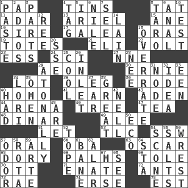 ACROSS 1. Infant food 4. Metal containers 8. Make lace 11. The sixth month of the Jewish calendar 13. Satellite of Uranus 15. One (Scot) 16. The founder of a family 17. An organ shaped like a helmet 18. Mouths or openings 19. Lugs 21. Connecticut Ivy Leaguer 22. Electrical Unit 23. Double-curved letter 24. _-fi 27. Compass dir. 29. Period of immesurable duration 30. Bert's buddy 34. Car dealer's back yard 36. Cassini of fashion 39. Wear away 40. Same (prefix) 41. Acquire or gain knowledge or skills 43. Arabian gulf 44. Sports stadium 46. Woody plant 47. Afternoon social gathering 48. Middle Eastern gold or silver currency 49. Toward shelter 51. Allow 53. Affectionate concern, for short 54. Compass dir. 57. Relating to the mouth 60. Chief or king in Benin or Nigeria 63. Witty Wilde 65. Dinghy 66. Insides of hands 69. Lacquered or enameled metalware 70. Baseball player Mel 71. Related on the mother's side 72. Pismires 73. Actress Charlotte 74. Celtic language 75. Eastern Standard Time (abbr.) DOWN 1. Thick mixture 2. Goodbye (Sp.) 3. Pieces 4. Label 5. Lyricist Gershwin 6. Mediterranean tributary 7. Sew up the eyelids of hawks and falcons 8. Pacific island yam 9. Of or related to the anus 10. Trial 12. To sift 14. (Had) reclined 18. Make much ado about nothing 20. Compass dir. 25. Calm and collected 26. An arm off of a larger body of water 28. Born 29. Without tonality 31. Connecting point 32. It may be bright or harebrained 33. Car or cant ending 34. Australian parrot (variant) 35. Presage 37. Ewer handle 38. Relatively large 40. Possessed 42. 1994 drama film starring Jodie Foster 45. "We ___ not amused" (Victoria) 50. Environmental prefix 52. Drink excessively 54. Biscuitlike quick bread 55. Table seasonings 56. Take or capture by force 57. Scent 58. Round or rotation of duties 59. Johnson of "Laugh-In" 61. Object of repulsion 62. Having or resembling wings 64. R.R. building 67. Mountains (abbr.) 68. Perceive with the eye