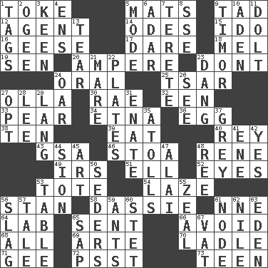 ACROSS 1. Puff or smoke 5. Floor protectors 9. Bit 12. Rep 14. Lyric poems 15. Wedding promise 16. Honkers 17. Have the gumption 18. Cartoonist voice _ Blanc 19. Elected rep. 20. Electrical Unit 23. Do not 24. Spoken 25. Russian ruler of old 27. Rounded earthenware pot or jar 30. Actress Charlotte 32. Car or cant ending 33. Lightbulb-shaped fruit 34. Inactive volcano in Sicily 36. Ovum 38. "___ Little Indians" 39. Ingest 40. Marina Del _, California 43. Girls' org. (abbr.) 46. Portico 48. French philosopher Descartes 49. Big collection agency 51. Pipe bend 52. Sight organs 53. Carryall 54. Goldbrick 56. Comedian Laurel of Laurel & Hardy 58. Small ungulate mammals of Africa 61. Compass dir. 64. Experiment locale 65. Posted 66. Keep away from 68. Everything 69. Johnson of "Laugh-In" 70. Dipping utensil 71. Unit of force equal to gravity 72. Inconspicuous attention getter 73. Adolescent DOWN 1. Labels 2. Double curve, resembling the letter S 3. Peachy ____! 4. Followers of ems 5. Method 6. The sixth month of the Jewish calendar 7. Cigar-shaped 8. Compass dir. 9. Southeast Indonesia island 10. An important port of Yemen 11. Dunce 13. Rend 21. Female horse 22. Food holders 23. Mild oath, euphamism for damn 24. Rowing implement 26. Observe 27. Elect 28. Area sheltered from the wind 29. Austrian-born American filmmaker Fritz 31. Maternal 35. Ringlike coral islands and reefs 37. Jennifer or Joel 41. Compass dir. 42. Consenting reply 44. The Jewish people; Israel 45. Tate display 47. Jai _ 48. To sift 50. Spring feasts 53. Eating place 55. Ardor 56. Volcanic refuse 57. Falsehood 59. Pismires 60. Proofreading order 61. Thickened enlargement 62. The longest river in the world 63. Genesis locale 65. Plant excrement 67. Large container