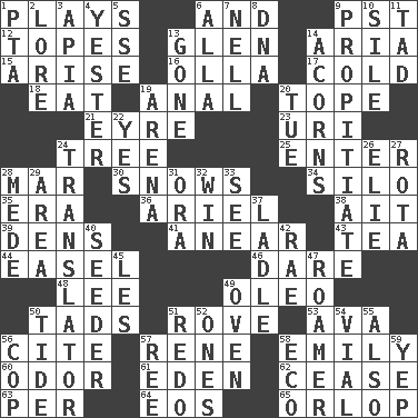 ACROSS 1. Romps 6. Added to 9. Pacific Standard Time (abbr.) 12. Drinks excessively 13. Small, secluded valley 14. Roberta Peters solo 15. Originate 16. Water jar 17. Having a low temperature 18. Erode 19. Of or related to the anus 20. Drink excessively 21. Jane of fiction 23. RI univ. 24. Woody plant 25. Keyboard key 28. Make imperfect 30. Frozen precipitation (plural) 34. Grain storage tower 35. Epoch 36. Satellite of Uranus 38. Small island 39. Lairs 41. Approach 43. Afternoon social gathering 44. Artist's stand 46. Have the gumption 48. Area sheltered from the wind 49. Butter sub 50. Bits 51. Be footloose 53. Actress Gardner 56. Quote 57. French philosopher Descartes 58. Poet Dickinson 60. Aroma 61. Genesis locale 62. Desist 63. For each 64. Greek goddess of the dawn 65. Lowest deck of a ship DOWN 1. Parent Teacher Assoc. 2. Old wives' tales, e.g. 3. Capital of Western Samoa 4. Last 5. Compass dir. 6. Silent film actress Nazimova 7. 1994 drama film starring Jodie Foster 8. Heredity factor (abbr.) 9. Conciliate 10. Filth; sediment 11. Bit 13. Went 14. Oak nuts 19. Sports stadium 20. Third day of the wk. 22. Affirmative reply 24. Interpreter 26. Writer Wiesel 27. Round or rotation of duties 28. Ancient Persian 29. Type of rug 31. Mouth or opening 32. Victory 33. Observe 37. Dipping utensil 40. Sowing specialist 42. Actress Charlotte 45. French article 47. Nomad 49. Baking chamber 50. Periodic rise and fall of the sea level 51. Redecorate 52. Singles 54. Small bottle 55. In addition 56. Police officer (slang) 57. To sift 58. Environmental prefix 59. Slangy assent