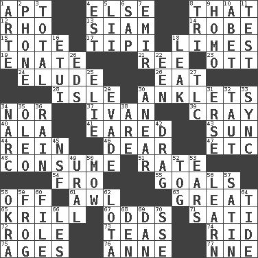 ACROSS 1. Fitting 4. Otherwise 8. Not this but _ 12. 17th letter of the Greek alphabet 13. Thailand, formerly 14. Loose flowing garment 15. Carryall 17. Native american tent (variation) 18. Citrus fruits 19. Maternal 21. To sift 23. Baseball player Mel 24. Evade 26. Consume 28. Capri or Wight 30. Short socks 34. Not either 37. "Terrible" tsar 39. Supercomputer manufacturer 40. Chicken ___ king 41. Having ears or earlike features 43. Player for Phoenix 44. It's straight from the horse's mouth 46. Letter starter 47. And so on (abbr.) 48. Ingest 51. Pace 54. From 55. Finish lines 58. No longer planned or scheduled 61. Leather borer 63. Relatively large 65. Shrimp-like planktonic crustaceans 67. Probability 71. Suttee (variant) 72. Hero or heavy, e.g. 73. Beverages made from leaves 74. To free from 75. Eons 76. Singer Murray 77. Compass dir. DOWN 1. Johnson of "Laugh-In" 2. Give a jingle 3. "_____ Recall" 4. Eastern Standard Time (abbr.) 5. Cards in a Roman deck? 6. Plant excrement 7. Arab leader 8. Three (prefix) 9. Same (prefix) 10. Collude with 11. Trial 16. Needle case 18. Path through which fluid escapes 20. Begley and Asner 22. Car or cant ending 25. Writer Wiesel 27. Affectionate concern, for short 29. Elude 30. Approach 31. Celtic language 32. Tense 33. Synchronize (abbr.) 34. Drug cop 35. Butter sub 36. Precipitation 38. "We ___ not amused" (Victoria) 42. To be drawn or hauled along 45. Overdraft (abbr.) 49. Mountain range 50. Cut the grass 52. Coat; cloak 53. Hearing organs 56. Acquire or gain knowledge or skills 57. Smooth fabric 58. Gumbo ingredient 59. Toadlike animal 60. Do some clerical work 62. Globular water bottle used in Asia 64. Periodic rise and fall of the sea level 66. French article 68. Lair 69. Daniel's nick name 70. Compass dir.