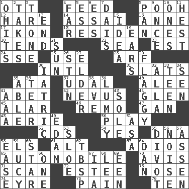 ACROSS 1. Baseball player Mel 4. Nourish 8. "Silly old bear" 12. Female horse 14. Slender Brazilian palm 16. Queen of England 1702-14 17. Visual representation of an object 18. Homes 20. Looks after 22. Ocean 23. Eastern Standard Time (abbr.) 24. Compass dir. 25. Purpose 28. Sandy's bark 30. International (abbr.) 31. Narrow boards 35. _ moment's notice (2 wds.) 37. Allodial 40. Toward shelter 41. Collude with 42. Mole, birthmark 44. Small, secluded valley 45. Having or resembling wings 46. San ____ (Riviera town) 47. Separate the seeds from cotton 48. Nest on high 50. Shaw product 52. Music discs 54. It is so 55. Heredity factor (abbr.) 58. Raised railways 61. Keyboard modifier key 63. Goodbye (Sp.) 65. Car 70. Deliberation 71. Glance over 72. First name in cosmetics 73. Sense of smell 74. Jane of fiction 75. Ache 76. "___ Little Indians" DOWN 1. Leaves out 2. Proceeds 3. Marketplace scale 4. At a great distance 5. Compass dir. 6. Double-curved letter 7. Raised platform 8. Baking dish 9. Single time 10. Washington bills 11. Behest 13. Conclude 15. The main thing one is thinking about 19. Hearing organs 21. Player for Phoenix 26. Make senseless or dizzy 27. A person who is older than you are 29. Tasteless 30. Of or pertaining to medicine 32. Silent film actress Nazimova 33. Adolescent 34. Elected rep. 35. Competent 36. Pull apart 38. "___ Maria" 39. Containing lumps 41. American Automobile Association (abbr.) 43. Not divided or shared with others 49. Dutch treat 51. White ___ sheet 53. _ gin 55. A piece of turf (Scot.) 56. Annoying sound 57. NE Netherlands city 58. Comfort 59. "I Love _" 60. Play the lead 62. Cook's measure (abbr.) 64. Daniel's nick name 66. Single 67. Call ___ day 68. Flowery wreath 69. Car or cant ending