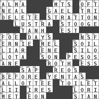 ACROSS 1. _ mater 5. Mountains (abbr.) 8. Often (poetically) 11. Anneal 12. Highlander 13. Three (prefix) 14. Erase 17. Ski resort town in Vermont 19. A period of five years 21. Moe Howard, for one 22. Hyperbolic tangent 23. Eastern Standard Time (abbr.) 24. Enemy 27. 24-hour periods 29. Overdraft (abbr.) 32. Bert's buddy 34. Cartoonist voice _ Blanc 36. Land 37. One who doesn't tell the truth 38. Compass dir. 39. Grain storage tower 40. Globular water bottle used in Asia 41. Male child 42. Mexican monetary units 43. One (Scot) 44. Writer of Portnoy's Complaint (1969) 46. Double-curved letter 47. Plant excrement 50. Vintage cars 52. Prior to 55. Gossips 57. One to whom something is allotted 59. Rest room 62. Cards in a Roman deck? 63. Angers 64. Australian parrot (variant) 65. Was introduced to 66. Period of immesurable duration 67. Comedian Laurel of Laurel & Hardy DOWN 1. Added to 2. Area sheltered from the wind 3. Promenade 4. Eskimo relative 5. Floor protector 6. Laconic 7. Narrow boards 8. Von Bismarck 9. Tree-dwelling hopper 10. Prong on a fork 12. Girls' org. (abbr.) 15. Sadhe (variant) 16. Inactive volcano in Sicily 18. Small child 20. Poems 24. Man or boy (slang) 25. Greek mythologigal hunter 26. Maternal 28. Sir (Sp.) 29. Annoying sound 30. Grain storage towers 31. Soft thread for cleaning between teeth 33. Lyricist Gershwin 35. Poe poem 36. Compass dir. 42. Picture 45. Portable shelter 47. "Barney Miller" actor Jack 48. Nick name for Arthur 49. Stone: prefix 51. Travels by water 52. Lip ointment 53. Writer Wiesel 54. Sudden quick movement 55. Consenting reply 56. Notch 58. Car or cant ending 60. Period 61. Shallow baking pan