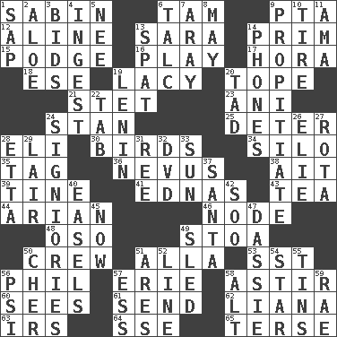 ACROSS 1. Unit of acoustic absorption 6. Scottish cap 9. Parent Teacher Assoc. 12. Place in a line 13. "Two Mules for Sister ____" 14. Demure 15. Plash 16. Frolic 17. Israeli folk dance 18. Compass dir. 19. Made of lace 20. Drink excessively 21. Proofreading order 23. Cuckoo 24. Comedian Laurel of Laurel & Hardy 25. Prevent from occurring 28. Biblical high priest 30. Avian creatures 34. Grain storage tower 35. Label 36. Congenital growth or mark on the skin 38. Small island 39. Prong on a fork 41. Ferber et al. 43. Beverage made from leaves 44. Believer in; advocate of (suffix) 46. Thickened enlargement 48. Bear (Spanish) 49. Portico 50. Group working together 51. Silent film actress Nazimova 53. Fast jet (abbr.) 56. Silvers or Donahue 57. 4th largest of the Great Lakes 58. Moving or stirring 60. Observes 61. Transmit 62. Climbing, woody, usually tropical vines 63. Big collection agency 64. Compass dir. 65. Laconic DOWN 1. Plant excrement 2. Medicinal plant 3. Auction offers 4. Consume 5. Born 6. Baby powder 7. Like ___ of sunshine 8. Can I? 9. Conciliate 10. Become fatigued 11. Nanny (var.) 13. Petty quarrel 14. Gives a jingle 19. Soviet premier 1918-24 20. Small boy 22. Bar bill 24. Seigniories (variant) 26. Writer Wiesel 27. Round or rotation of duties 28. Singer James 29. Den 31. To separate or throw off 32. Movie disc 33. Player for Phoenix 37. Before Barbara or Clara 40. Artist's stands 42. "Barney Miller" actor Jack 45. Immediately 47. Small ungulate mammals of Africa 49. Downhill vehicle 50. "Mermaids" star 51. Ancient Greek god of war 52. Actor's bit 54. Play the lead 55. Metal containers 56. 23rd letter of the Greek alphabet 57. Curvy letter 58. Keyboard modifier key 59. Actress Charlotte
