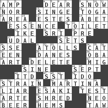 ACROSS 1. Electrical Unit 4. Letter starter 8. Overwhelm 12. And not 13. Scorch 14. Ancient Roman robe 15. Type of rug 17. _____ Park, CO 18. Collude with 19. Substance 21. Bathroom 23. Mamie's husband 24. _ Lanka 26. Before (prefix) 27. Hereditary estate 28. Arranges properly for use 30. Compass dir. 31. Ringlike coral islands and reefs 34. Domesticated feline 37. Car or cant ending 38. Natives or inhabitants of Denmark 39. Chief or king in Benin or Nigeria 40. Tate display 41. Erase 42. Russian fighter aircraft 43. Trig term 44. Back-to-school mo. 46. It would 47. Fast jet (abbr.) 50. Wedding promise 51. Put through a sieve 54. Chrissie's court nemesis 57. One who doesn't tell the truth 58. 1973 Nobel Price Winner (Physics) Leo 60. Trial 62. Johnson of "Laugh-In" 63. Tear up 64. Modern: prefix 65. Fermented drink made from hops 66. Folds over and sews together 67. The 23rd letter of the Hebrew alphabet DOWN 1. Santa ___, CA 2. Greater amount 3. Elected leader of a country 4. Flat circles 5. Keyboard key 6. Personal question 7. Repose 8. Flight of steps 9. Impressive in appearance 10. Double curve, resembling the letter S 11. Electrical Unit 13. Elected rep. 16. "____ silly question..." 20. Snakelike fish 22. Chooses 25. Small island 27. One who makes use of a thing 29. Otherwise 30. Ocean 31. Arabian gulf 32. Lies 33. Single 34. Piece 35. "This won't hurt ____!" 36. Label 41. "You Light Up My Life" star Conn 43. A viewer who gazes fixedly 44. Be seated 45. Prepare for publication 46. Feeling or showing extreme anger 48. Excessive but superficial compliments 49. Receives possession of 51. Broad, flat, thick piece 52. Become fatigued 53. Soft 55. To free from 56. Toward the sea 59. A female animal or person 61. Pull behind