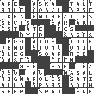 ACROSS 1. "We ___ not amused" (Victoria) 4. "____ silly question..." 8. Tense 12. Cause heat under the collar 14. Team commander 16. Domed church section 17. The main thing one is thinking about 18. Pleas 20. Religious groups 22. Hearing organ 23. Tate display 24. Eastern Standard Time (abbr.) 25. Had dinner 28. Personal Computers (abbr.) 30. Colored 31. Gurus 35. Sometimes accompanies a hiss 37. Helper 40. Lacquered or enameled metalware 41. Tear apart 42. Feeling sharp psychological pain 44. A single undivided whole 45. Cassini of fashion 46. Fly high 47. To sift 48. Fertile tracts in a desert 50. Adolescent 52. Perceive with the eye 54. Sight organ 55. Afternoon social gathering 58. Bear (Spanish) 61. Label 63. Rhinal 65. Frustrating wastes of time 70. Suttee (variant) 71. Silent film actress Nazimova 72. Practice fights 73. Arabian gulf 74. Ooze 75. Petty quarrel 76. Compass dir. DOWN 1. Originate 2. Amusement-park features 3. Voters do this 4. Adept person 5. Boy, to dad 6. Krazy ___ of comics 7. 43,560 square feet 8. Make lace 9. Capital of Western Samoa 10. One who uses or employs something 11. Trial 13. Consume 15. Pile 19. Curves 21. Declare 26. Afternoon social gatherings 27. Proofreads 29. Titan orbits this 30. Evades 32. Went 33. Writer Wiesel 34. Arrange properly for use 35. Actor Lugosi 36. Singles 38. Superhero pair 39. Related on the mother's side 41. Friend of Pooh 43. Jennifer or Joel 49. Stalk of a moss capsule 51. Car or cant ending 53. Hearing organs 55. Sadhe (variant) 56. Consumed 57. Place in a line 58. Mouths or openings 59. Filth; sediment 60. Stare at amorously 62. Republicans 64. White ___ sheet 66. Atlas unit 67. Pet locale 68. Epoch 69. Fast jet (abbr.)