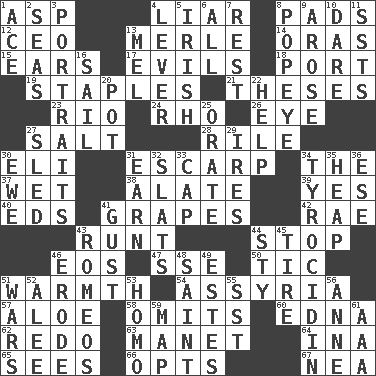 ACROSS 1. Viper 4. One who doesn't tell the truth 8. Groovy apts. 12. Corporate head (abbr.) 13. Haggard of country music 14. Mouths or openings 15. Hearing organs 17. Vices 18. Sweet dark-red dessert wine 19. Paper fasteners 21. College papers 23. _ de Janeiro 24. 17th letter of the Greek alphabet 26. Sight organ 27. Table seasoning 28. Cause heat under the collar 30. Biblical high priest 31. Fortification 34. Definite Article 37. Dripping 38. Having winglike extensions 39. Affirmative reply 40. Begley and Asner 41. Wine fruits 42. Actress Charlotte 43. The smallest animal of a litter 44. Halt 46. Greek goddess of the dawn 47. Compass dir. 50. Nervous spasm 51. Heat 54. Nineveh was its capital 57. _ vera 58. Leaves out 60. Pulitzer Prize-winning author Ferber 62. Make new 63. French painter Edouard 64. _ tizzy (2 wds.) 65. Perceives with the eye 66. Chooses 67. Teachers' org. DOWN 1. Adept person 2. Oceans 3. Likenesses of persons 4. Prying instrument 5. From or relating to Ireland 6. Everything 7. State of inaction 8. Wimpy's pal 9. Came up 10. Have the gumption 11. Fast planes 13. Cartoonist voice _ Blanc 16. Move on water 20. Plant holder 22. Aid 25. Speak pompously 27. Downhill vehicle 29. Angers 30. She-sheep 31. Merit 32. Narrow boards 33. Head covering 34. Polypeptide antibiotic 35. Pile 36. Compass dir. 41. Abrupt rush of wind 43. Lover boys 44. Filthy place 45. Become fatigued 46. Eat (away) 48. Virtuous person 49. _____ Park, CO 51. Armed conflicts 52. Toward shelter 53. Same (prefix) 55. Fast jet (abbr.) 56. Queen of England 1702-14 59. Atlas unit 61. Auto club (abbr.)