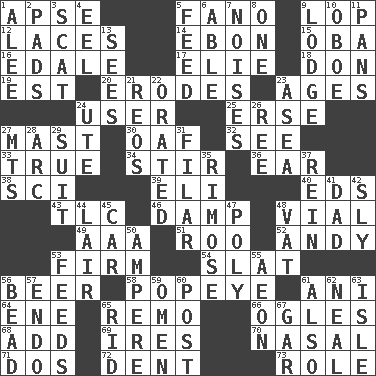 ACROSS 1. Domed church section 5. Papal veil 9. Trim (branches) 12. Shoestrings 14. Inky black, to poets 15. Chief or king in Benin or Nigeria 16. Peak District village in England 17. Writer Wiesel 18. Spanish title 19. Eastern Standard Time (abbr.) 20. Eats (away) 23. Grows older 24. One who makes use of a thing 25. Celtic language 27. Vertical spar for supporting sails 30. Clumsy lout 32. Observe 33. Loyal 34. Use a swizzle stick 36. Hearing organ 38. _-fi 39. Biblical high priest 40. Begley and Asner 43. Affectionate concern, for short 46. Moist 48. Small bottle 49. American Automobile Association (abbr.) 51. Friend of Pooh 52. "60 Minutes" Commentator Rooney 53. Not soft or yielding to pressure 54. Narrow board 56. Fermented drink made from hops 58. Wimpy's pal 61. Black tropical American cuckoo 64. Compass dir. 65. San ____ (Riviera town) 66. Stares 68. Find the sum of 69. Angers 70. Rhinal 71. Two (Sp.) 72. Undesirable depression on a surface 73. Hero or heavy, e.g. DOWN 1. Toward shelter 2. Groovy apts. 3. Scram, to a cat 4. Snakelike fish 5. Nourish 6. Competent 7. Annoying sounds 8. Single 9. Cabin 10. Mitch Miller's instrument 11. Zero-star reviews 13. Perceives with the eye 21. Vintage cars 22. Declaimed 23. Toward the sea 24. Shoshoni 26. To separate or throw off 27. Mountains (abbr.) 28. Curve 29. Set of matching outer garments 31. Having threads 35. Full of chinks, cracks, or crevices 37. It's straight from the horse's mouth 41. Male parent 42. Mischievous 44. Den 45. Automobile 47. More than one (prefix) 48. Large container 50. Electrical Unit 53. Eats 55. Period of immesurable duration 56. Necklace unit 57. Inside; within (prefix) 59. Presage 60. Mail 61. In addition 62. Actress Patricia 63. Capri or Wight 65. To free from 67. Slender fish