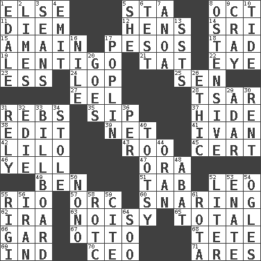 ACROSS 1. Otherwise 5. R.R. building 8. Sep. follower 11. South Vietnam president (1954) 12. Coop moms 14. Indian title of respect (Mr.) 15. With great haste 17. Mexican monetary units 18. Small boy 19. Small, flat, pigmented spot on the skin 21. Make lace 22. Sight organ 23. Curvy letter 24. Chop off 25. Elected rep. 27. Snakelike fish 28. Russian ruler of old 31. Confederate soldiers (slang) 35. Small drink 37. Flintstone garb 38. Prepare for publication 39. Remaining after all deductions 41. _ the terrible 42. _ and Stitch 43. Friend of Pooh 45. Certainty 46. Shout 47. Mouth or opening 49. Benjamin's nick name 51. Keyboard key 52. Lion 55. _ de Janeiro 57. The grampus (Milton) 60. Catching in a trap 62. Retirement account (abbr.) 63. Annoyingly loud 65. Add up to 66. Slender fish 67. Von Bismarck 68. False hair 69. Working for oneself (abbr.) 70. Corporate head (abbr.) 71. Ancient Greek god of war DOWN 1. Peak District village in England 2. Citrus fruits 3. Seines 4. Give off 5. A female animal or person 6. Trial 7. Small Philippine buffalo 8. Clearly or manifestly demonstrative 9. Supercomputer manufacturer 10. Periodic rise and fall of the sea level 13. Fast planes 16. Mediterranean tributary 17. Cotton for raincoats, e.g. 20. Travels 26. Moral principle 29. The sixth month of the Jewish calendar 30. Monthly bill 31. Trust 32. Singer Brickell 33. Big road sign 34. Took without asking 36. For each 40. A girl or young woman (variant) 44. Northwest Algerian city 48. Blind as ____ 50. Words to Nanette 52. 61 cubic inches 53. Related on the mother's side 54. Stares 55. Swiss mountan, "Queen of the Mountains" 56. SW Asia republic 58. College mil. group 59. Quote 61. Round or rotation of duties 64. "Barney Miller" actor Jack
